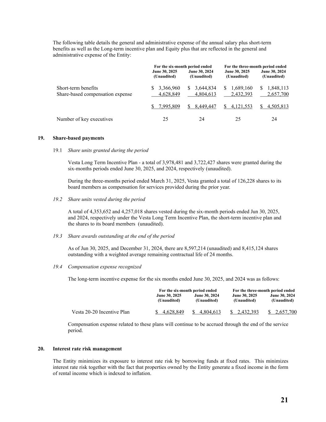 21 The following table details the general and administrative expense of the annual salary plus short-term benefits as well as the Long-term incentive plan and Equity plus that are reflected in the general and administrative expense of the Entity: For the six-month period ended For the three-month period ended June 30, 2025 (Unaudited) June 30, 2024 (Unaudited) June 30, 2025 (Unaudited) June 30, 2024 (Unaudited) Short-term benefits $ 3,366,960 $ 3,644,834 $ 1,689,160 $ 1,848,113 Share-based compensation expense 4,628,849 4,804,613 2,432,393 2,657,700 $ 7,995,809 $ 8,449,447 $ 4,121,553 $ 4,505,813 Number of key executives 25 24 25 24 19. Share-based payments 19.1 Share units granted during the period Vesta Long Term Incentive Plan - a total of 3,978,481 and 3,722,427 shares were granted during the six-months periods ended June 30, 2025, and 2024, respectively (unaudited). During the three-months period ended March 31, 2025, Vesta granted a total of 126,228 shares to its board members as compensation for services provided during the prior year. 19.2 Share units vested during the period A total of 4,353,652 and 4,257,018 shares vested during the six-month periods ended Jun 30, 2025, and 2024, respectively under the Vesta Long Term Incentive Plan, the short-term incentive plan and the shares to its board members (unaudited). 19.3 Share awards outstanding at the end of the period As of Jun 30, 2025, and December 31, 2024, there are 8,597,214 (unaudited) and 8,415,124 shares outstanding with a weighted average remaining contractual life of 24 months. 19.4 Compensation expense recognized The long-term incentive expense for the six months ended June 30, 2025, and 2024 was as follows: For the six-month period ended For the three-month period ended June 30, 2025 (Unaudited) June 30, 2024 (Unaudited) June 30, 2025 (Unaudited) June 30, 2024 (Unaudited) Vesta 20-20 Incentive Plan $ 4,628,849 $ 4,804,613 $ 2,432,393 $ 2,657,700 Compensation expense related to these plans will continue to be accrued through the end of the service period. 20. Interest rate risk management The Entity minimizes its exposure to interest rate risk by borrowing funds at fixed rates. This minimizes interest rate risk together with the fact that properties owned by the Entity generate a fixed income in the form of rental income which is indexed to inflation.