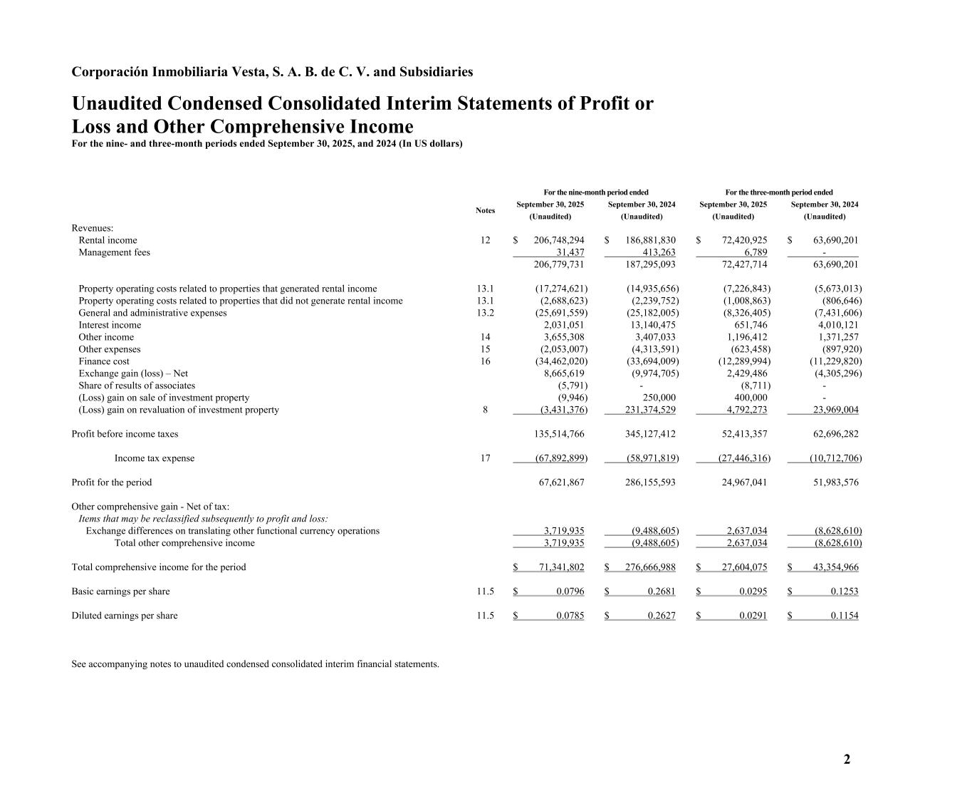 2 Corporación Inmobiliaria Vesta, S. A. B. de C. V. and Subsidiaries Unaudited Condensed Consolidated Interim Statements of Profit or Loss and Other Comprehensive Income For the nine- and three-month periods ended September 30, 2025, and 2024 (In US dollars) For the nine-month period ended For the three-month period ended Notes September 30, 2025 (Unaudited) September 30, 2024 (Unaudited) September 30, 2025 (Unaudited) September 30, 2024 (Unaudited) Revenues: Rental income 12 $ 206,748,294 $ 186,881,830 $ 72,420,925 $ 63,690,201 Management fees 31,437 413,263 6,789 - 206,779,731 187,295,093 72,427,714 63,690,201 Property operating costs related to properties that generated rental income 13.1 (17,274,621) (14,935,656) (7,226,843) (5,673,013) Property operating costs related to properties that did not generate rental income 13.1 (2,688,623) (2,239,752) (1,008,863) (806,646) General and administrative expenses 13.2 (25,691,559) (25,182,005) (8,326,405) (7,431,606) Interest income 2,031,051 13,140,475 651,746 4,010,121 Other income 14 3,655,308 3,407,033 1,196,412 1,371,257 Other expenses 15 (2,053,007) (4,313,591) (623,458) (897,920) Finance cost 16 (34,462,020) (33,694,009) (12,289,994) (11,229,820) Exchange gain (loss) – Net 8,665,619 (9,974,705) 2,429,486 (4,305,296) Share of results of associates (5,791) - (8,711) - (Loss) gain on sale of investment property (9,946) 250,000 400,000 - (Loss) gain on revaluation of investment property 8 (3,431,376) 231,374,529 4,792,273 23,969,004 Profit before income taxes 135,514,766 345,127,412 52,413,357 62,696,282 Income tax expense 17 (67,892,899) (58,971,819) (27,446,316) (10,712,706) Profit for the period 67,621,867 286,155,593 24,967,041 51,983,576 Other comprehensive gain - Net of tax: Items that may be reclassified subsequently to profit and loss: Exchange differences on translating other functional currency operations 3,719,935 (9,488,605) 2,637,034 (8,628,610) Total other comprehensive income 3,719,935 (9,488,605) 2,637,034 (8,628,610) Total comprehensive income for the period $ 71,341,802 $ 276,666,988 $ 27,604,075 $ 43,354,966 Basic earnings per share 11.5 $ 0.0796 $ 0.2681 $ 0.0295 $ 0.1253 Diluted earnings per share 11.5 $ 0.0785 $ 0.2627 $ 0.0291 $ 0.1154 See accompanying notes to unaudited condensed consolidated interim financial statements.