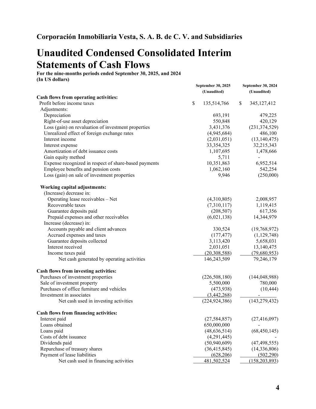 4 Corporación Inmobiliaria Vesta, S. A. B. de C. V. and Subsidiaries Unaudited Condensed Consolidated Interim Statements of Cash Flows For the nine-months periods ended September 30, 2025, and 2024 (In US dollars) September 30, 2025 (Unaudited) September 30, 2024 (Unaudited) Cash flows from operating activities: Profit before income taxes $ 135,514,766 $ 345,127,412 Adjustments: Depreciation 693,191 479,225 Right-of-use asset depreciation 550,848 420,129 Loss (gain) on revaluation of investment properties 3,431,376 (231,374,529) Unrealized effect of foreign exchange rates (4,945,684) 486,100 Interest income (2,031,051) (13,140,475) Interest expense 33,354,325 32,215,343 Amortization of debt issuance costs 1,107,695 1,478,666 Gain equity method 5,711 - Expense recognized in respect of share-based payments 10,351,863 6,952,514 Employee benefits and pension costs 1,062,160 542,254 Loss (gain) on sale of investment properties 9,946 (250,000) Working capital adjustments: (Increase) decrease in: Operating lease receivables – Net (4,310,805) 2,008,957 Recoverable taxes (7,310,117) 1,119,415 Guarantee deposits paid (208,507) 617,356 Prepaid expenses and other receivables (6,021,138) 14,344,979 Increase (decrease) in: Accounts payable and client advances 330,524 (19,768,972) Accrued expenses and taxes (177,477) (1,129,748) Guarantee deposits collected 3,113,420 5,658,031 Interest received 2,031,051 13,140,475 Income taxes paid (20,308,588) (79,680,953) Net cash generated by operating activities 146,243,509 79,246,179 Cash flows from investing activities: Purchases of investment properties (226,508,180) (144,048,988) Sale of investment property 5,500,000 780,000 Purchases of office furniture and vehicles (473,938) (10,444) Investment in associates (3,442,268) - Net cash used in investing activities (224,924,386) (143,279,432) Cash flows from financing activities: Interest paid (27,584,857) (27,416,097) Loans obtained 650,000,000 - Loans paid (48,636,514) (68,450,145) Costs of debt issuance (4,291,445) - Dividends paid (50,940,609) (47,498,555) Repurchase of treasury shares (36,415,845) (14,336,806) Payment of lease liabilities (628,206) (502,290) Net cash used in financing activities 481,502,524 (158,203,893)