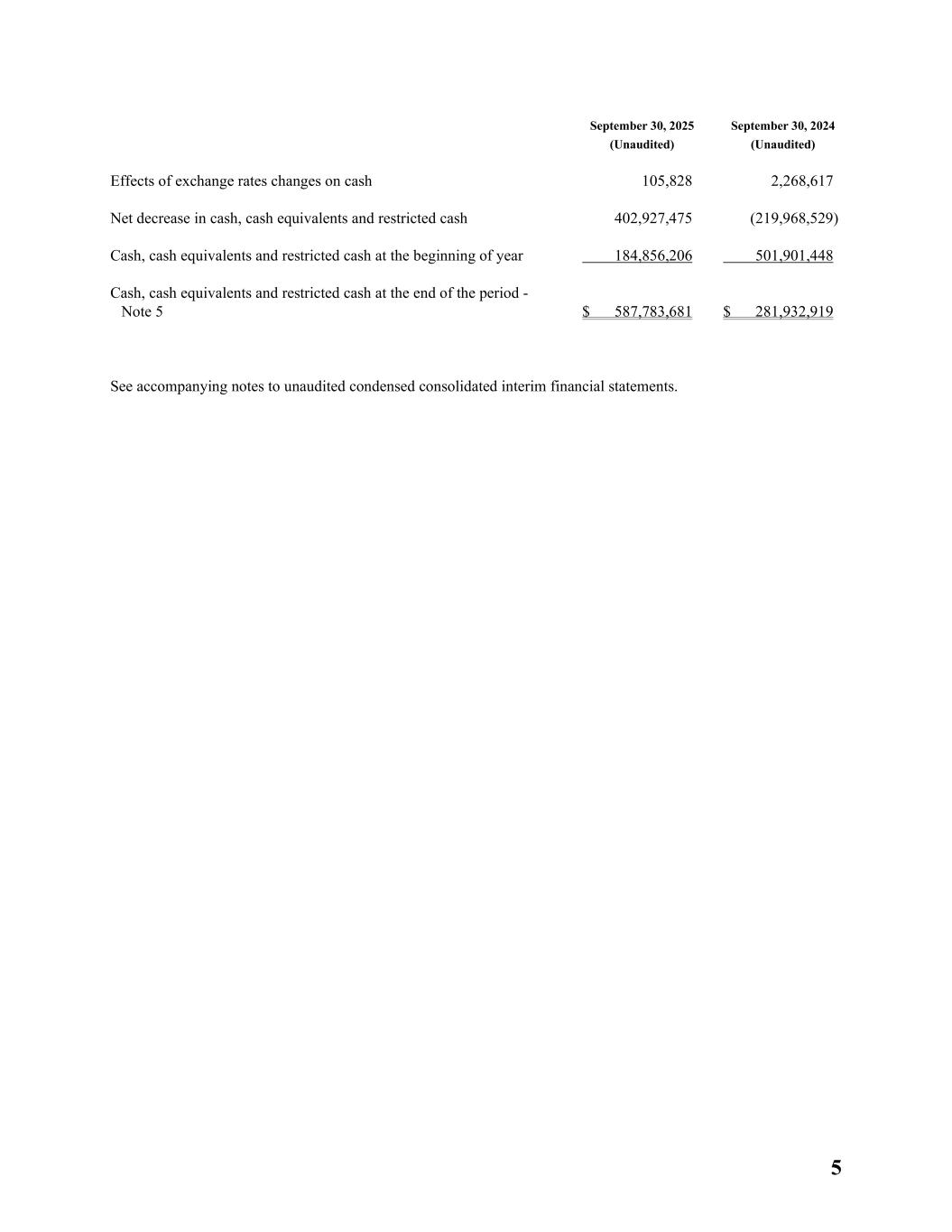 5 September 30, 2025 (Unaudited) September 30, 2024 (Unaudited) Effects of exchange rates changes on cash 105,828 2,268,617 Net decrease in cash, cash equivalents and restricted cash 402,927,475 (219,968,529) Cash, cash equivalents and restricted cash at the beginning of year 184,856,206 501,901,448 Cash, cash equivalents and restricted cash at the end of the period - Note 5 $ 587,783,681 $ 281,932,919 See accompanying notes to unaudited condensed consolidated interim financial statements.