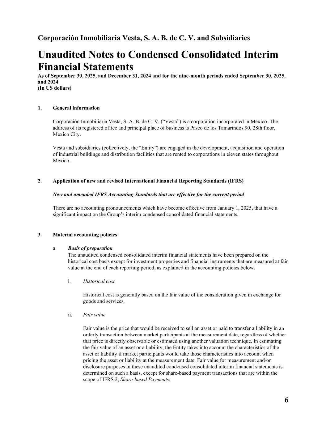 6 Corporación Inmobiliaria Vesta, S. A. B. de C. V. and Subsidiaries Unaudited Notes to Condensed Consolidated Interim Financial Statements As of September 30, 2025, and December 31, 2024 and for the nine-month periods ended September 30, 2025, and 2024 (In US dollars) 1. General information Corporación Inmobiliaria Vesta, S. A. B. de C. V. (“Vesta”) is a corporation incorporated in Mexico. The address of its registered office and principal place of business is Paseo de los Tamarindos 90, 28th floor, Mexico City. Vesta and subsidiaries (collectively, the “Entity”) are engaged in the development, acquisition and operation of industrial buildings and distribution facilities that are rented to corporations in eleven states throughout Mexico. 2. Application of new and revised International Financial Reporting Standards (IFRS) New and amended IFRS Accounting Standards that are effective for the current period There are no accounting pronouncements which have become effective from January 1, 2025, that have a significant impact on the Group’s interim condensed consolidated financial statements. 3. Material accounting policies a. Basis of preparation The unaudited condensed consolidated interim financial statements have been prepared on the historical cost basis except for investment properties and financial instruments that are measured at fair value at the end of each reporting period, as explained in the accounting policies below. i. Historical cost Historical cost is generally based on the fair value of the consideration given in exchange for goods and services. ii. Fair value Fair value is the price that would be received to sell an asset or paid to transfer a liability in an orderly transaction between market participants at the measurement date, regardless of whether that price is directly observable or estimated using another valuation technique. In estimating the fair value of an asset or a liability, the Entity takes into account the characteristics of the asset or liability if market participants would take those characteristics into account when pricing the asset or liability at the measurement date. Fair value for measurement and/or disclosure purposes in these unaudited condensed consolidated interim financial statements is determined on such a basis, except for share-based payment transactions that are within the scope of IFRS 2, Share-based Payments.