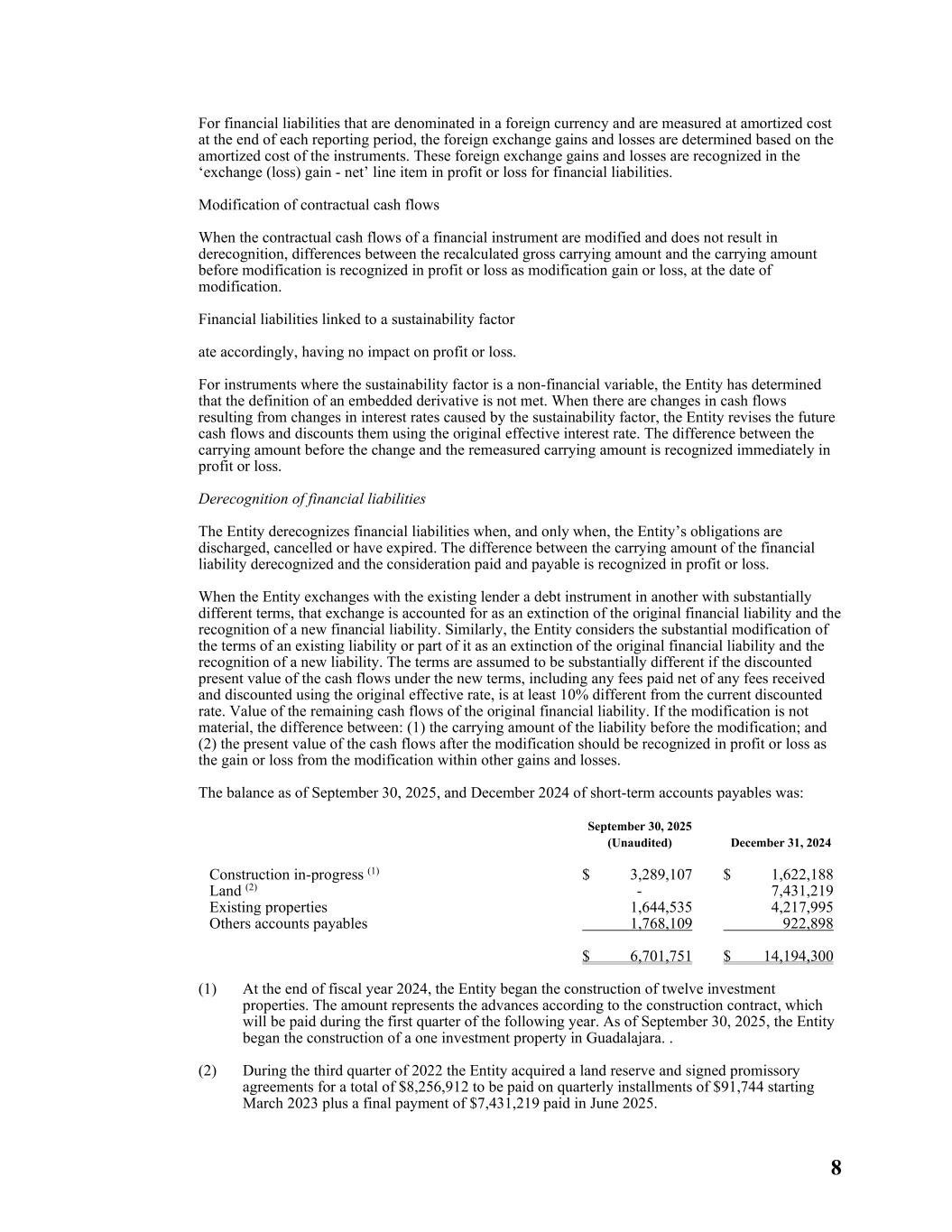 8 For financial liabilities that are denominated in a foreign currency and are measured at amortized cost at the end of each reporting period, the foreign exchange gains and losses are determined based on the amortized cost of the instruments. These foreign exchange gains and losses are recognized in the ‘exchange (loss) gain - net’ line item in profit or loss for financial liabilities. Modification of contractual cash flows When the contractual cash flows of a financial instrument are modified and does not result in derecognition, differences between the recalculated gross carrying amount and the carrying amount before modification is recognized in profit or loss as modification gain or loss, at the date of modification. Financial liabilities linked to a sustainability factor ate accordingly, having no impact on profit or loss. For instruments where the sustainability factor is a non-financial variable, the Entity has determined that the definition of an embedded derivative is not met. When there are changes in cash flows resulting from changes in interest rates caused by the sustainability factor, the Entity revises the future cash flows and discounts them using the original effective interest rate. The difference between the carrying amount before the change and the remeasured carrying amount is recognized immediately in profit or loss. Derecognition of financial liabilities The Entity derecognizes financial liabilities when, and only when, the Entity’s obligations are discharged, cancelled or have expired. The difference between the carrying amount of the financial liability derecognized and the consideration paid and payable is recognized in profit or loss. When the Entity exchanges with the existing lender a debt instrument in another with substantially different terms, that exchange is accounted for as an extinction of the original financial liability and the recognition of a new financial liability. Similarly, the Entity considers the substantial modification of the terms of an existing liability or part of it as an extinction of the original financial liability and the recognition of a new liability. The terms are assumed to be substantially different if the discounted present value of the cash flows under the new terms, including any fees paid net of any fees received and discounted using the original effective rate, is at least 10% different from the current discounted rate. Value of the remaining cash flows of the original financial liability. If the modification is not material, the difference between: (1) the carrying amount of the liability before the modification; and (2) the present value of the cash flows after the modification should be recognized in profit or loss as the gain or loss from the modification within other gains and losses. The balance as of September 30, 2025, and December 2024 of short-term accounts payables was: September 30, 2025 (Unaudited) December 31, 2024 Construction in-progress (1) $ 3,289,107 $ 1,622,188 Land (2) - 7,431,219 Existing properties 1,644,535 4,217,995 Others accounts payables 1,768,109 922,898 $ 6,701,751 $ 14,194,300 (1) At the end of fiscal year 2024, the Entity began the construction of twelve investment properties. The amount represents the advances according to the construction contract, which will be paid during the first quarter of the following year. As of September 30, 2025, the Entity began the construction of a one investment property in Guadalajara. . (2) During the third quarter of 2022 the Entity acquired a land reserve and signed promissory agreements for a total of $8,256,912 to be paid on quarterly installments of $91,744 starting March 2023 plus a final payment of $7,431,219 paid in June 2025.