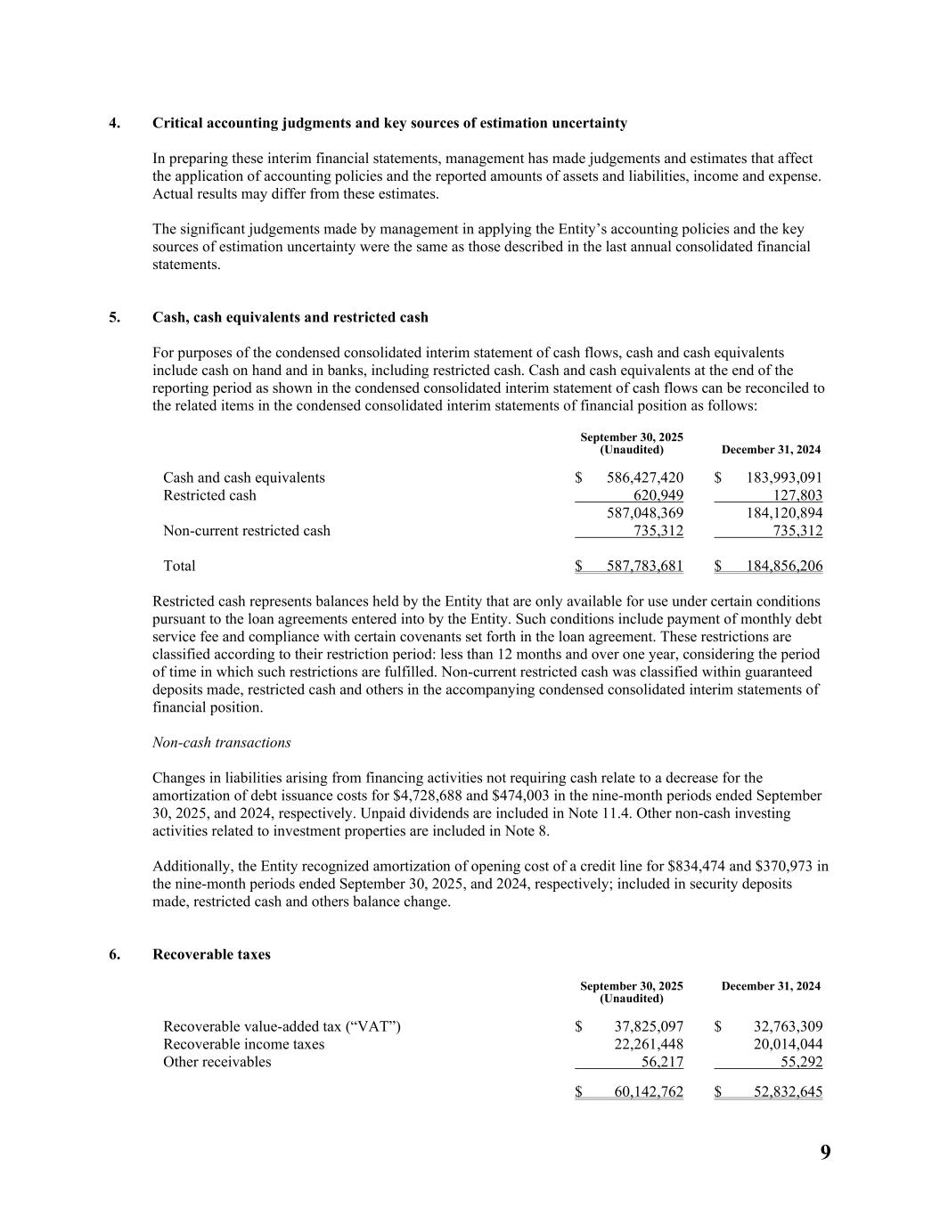 9 4. Critical accounting judgments and key sources of estimation uncertainty In preparing these interim financial statements, management has made judgements and estimates that affect the application of accounting policies and the reported amounts of assets and liabilities, income and expense. Actual results may differ from these estimates. The significant judgements made by management in applying the Entity’s accounting policies and the key sources of estimation uncertainty were the same as those described in the last annual consolidated financial statements. 5. Cash, cash equivalents and restricted cash For purposes of the condensed consolidated interim statement of cash flows, cash and cash equivalents include cash on hand and in banks, including restricted cash. Cash and cash equivalents at the end of the reporting period as shown in the condensed consolidated interim statement of cash flows can be reconciled to the related items in the condensed consolidated interim statements of financial position as follows: September 30, 2025 (Unaudited) December 31, 2024 Cash and cash equivalents $ 586,427,420 $ 183,993,091 Restricted cash 620,949 127,803 587,048,369 184,120,894 Non-current restricted cash 735,312 735,312 Total $ 587,783,681 $ 184,856,206 Restricted cash represents balances held by the Entity that are only available for use under certain conditions pursuant to the loan agreements entered into by the Entity. Such conditions include payment of monthly debt service fee and compliance with certain covenants set forth in the loan agreement. These restrictions are classified according to their restriction period: less than 12 months and over one year, considering the period of time in which such restrictions are fulfilled. Non-current restricted cash was classified within guaranteed deposits made, restricted cash and others in the accompanying condensed consolidated interim statements of financial position. Non‑cash transactions Changes in liabilities arising from financing activities not requiring cash relate to a decrease for the amortization of debt issuance costs for $4,728,688 and $474,003 in the nine-month periods ended September 30, 2025, and 2024, respectively. Unpaid dividends are included in Note 11.4. Other non-cash investing activities related to investment properties are included in Note 8. Additionally, the Entity recognized amortization of opening cost of a credit line for $834,474 and $370,973 in the nine-month periods ended September 30, 2025, and 2024, respectively; included in security deposits made, restricted cash and others balance change. 6. Recoverable taxes September 30, 2025 (Unaudited) December 31, 2024 Recoverable value-added tax (“VAT”) $ 37,825,097 $ 32,763,309 Recoverable income taxes 22,261,448 20,014,044 Other receivables 56,217 55,292 $ 60,142,762 $ 52,832,645