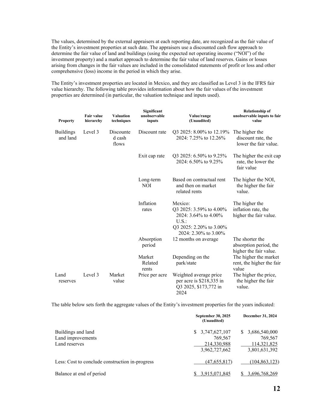 12 The values, determined by the external appraisers at each reporting date, are recognized as the fair value of the Entity’s investment properties at such date. The appraisers use a discounted cash flow approach to determine the fair value of land and buildings (using the expected net operating income (“NOI”) of the investment property) and a market approach to determine the fair value of land reserves. Gains or losses arising from changes in the fair values are included in the consolidated statements of profit or loss and other comprehensive (loss) income in the period in which they arise. The Entity’s investment properties are located in Mexico, and they are classified as Level 3 in the IFRS fair value hierarchy. The following table provides information about how the fair values of the investment properties are determined (in particular, the valuation technique and inputs used). Property Fair value hierarchy Valuation techniques Significant unobservable inputs Value/range (Unaudited) Relationship of unobservable inputs to fair value Buildings and land Level 3 Discounte d cash flows Discount rate Q3 2025: 8.00% to 12.19% 2024: 7.25% to 12.26% The higher the discount rate, the lower the fair value. Exit cap rate Q3 2025: 6.50% to 9.25% 2024: 6.50% to 9.25% The higher the exit cap rate, the lower the fair value Long-term NOI Based on contractual rent and then on market related rents The higher the NOI, the higher the fair value. Inflation rates Mexico: Q3 2025: 3.59% to 4.00% 2024: 3.64% to 4.00% U.S.: Q3 2025: 2.20% to 3.00% 2024: 2.30% to 3.00% The higher the inflation rate, the higher the fair value. Absorption period 12 months on average The shorter the absorption period, the higher the fair value. Market Related rents Depending on the park/state The higher the market rent, the higher the fair value Land reserves Level 3 Market value Price per acre Weighted average price per acre is $218,335 in Q3 2025, $173,772 in 2024 The higher the price, the higher the fair value. The table below sets forth the aggregate values of the Entity’s investment properties for the years indicated: September 30, 2025 (Unaudited) December 31, 2024 Buildings and land $ 3,747,627,107 $ 3,686,540,000 Land improvements 769,567 769,567 Land reserves 214,330,988 114,321,825 3,962,727,662 3,801,631,392 Less: Cost to conclude construction in-progress (47,655,817) (104,863,123) Balance at end of period $ 3,915,071,845 $ 3,696,768,269