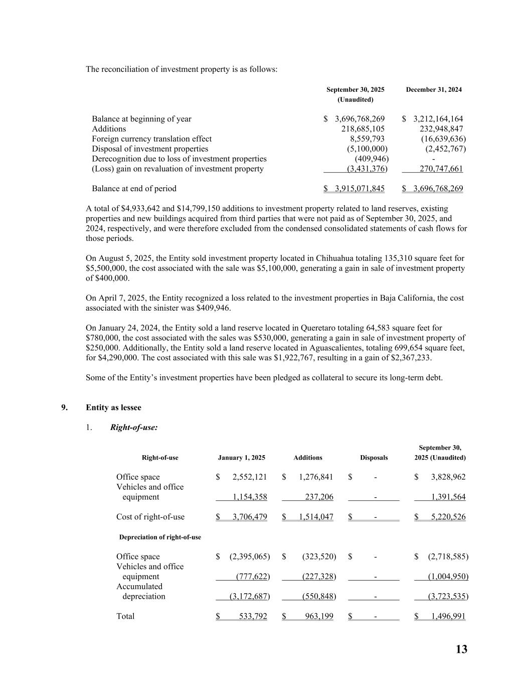 13 The reconciliation of investment property is as follows: September 30, 2025 (Unaudited) December 31, 2024 Balance at beginning of year $ 3,696,768,269 $ 3,212,164,164 Additions 218,685,105 232,948,847 Foreign currency translation effect 8,559,793 (16,639,636) Disposal of investment properties (5,100,000) (2,452,767) Derecognition due to loss of investment properties (409,946) - (Loss) gain on revaluation of investment property (3,431,376) 270,747,661 Balance at end of period $ 3,915,071,845 $ 3,696,768,269 A total of $4,933,642 and $14,799,150 additions to investment property related to land reserves, existing properties and new buildings acquired from third parties that were not paid as of September 30, 2025, and 2024, respectively, and were therefore excluded from the condensed consolidated statements of cash flows for those periods. On August 5, 2025, the Entity sold investment property located in Chihuahua totaling 135,310 square feet for $5,500,000, the cost associated with the sale was $5,100,000, generating a gain in sale of investment property of $400,000. On April 7, 2025, the Entity recognized a loss related to the investment properties in Baja California, the cost associated with the sinister was $409,946. On January 24, 2024, the Entity sold a land reserve located in Queretaro totaling 64,583 square feet for $780,000, the cost associated with the sales was $530,000, generating a gain in sale of investment property of $250,000. Additionally, the Entity sold a land reserve located in Aguascalientes, totaling 699,654 square feet, for $4,290,000. The cost associated with this sale was $1,922,767, resulting in a gain of $2,367,233. Some of the Entity’s investment properties have been pledged as collateral to secure its long-term debt. 9. Entity as lessee 1. Right-of-use: Right-of-use January 1, 2025 Additions Disposals September 30, 2025 (Unaudited) Office space $ 2,552,121 $ 1,276,841 $ - $ 3,828,962 Vehicles and office equipment 1,154,358 237,206 - 1,391,564 Cost of right-of-use $ 3,706,479 $ 1,514,047 $ - $ 5,220,526 Depreciation of right-of-use Office space $ (2,395,065) $ (323,520) $ - $ (2,718,585) Vehicles and office equipment (777,622) (227,328) - (1,004,950) Accumulated depreciation (3,172,687) (550,848) - (3,723,535) Total $ 533,792 $ 963,199 $ - $ 1,496,991