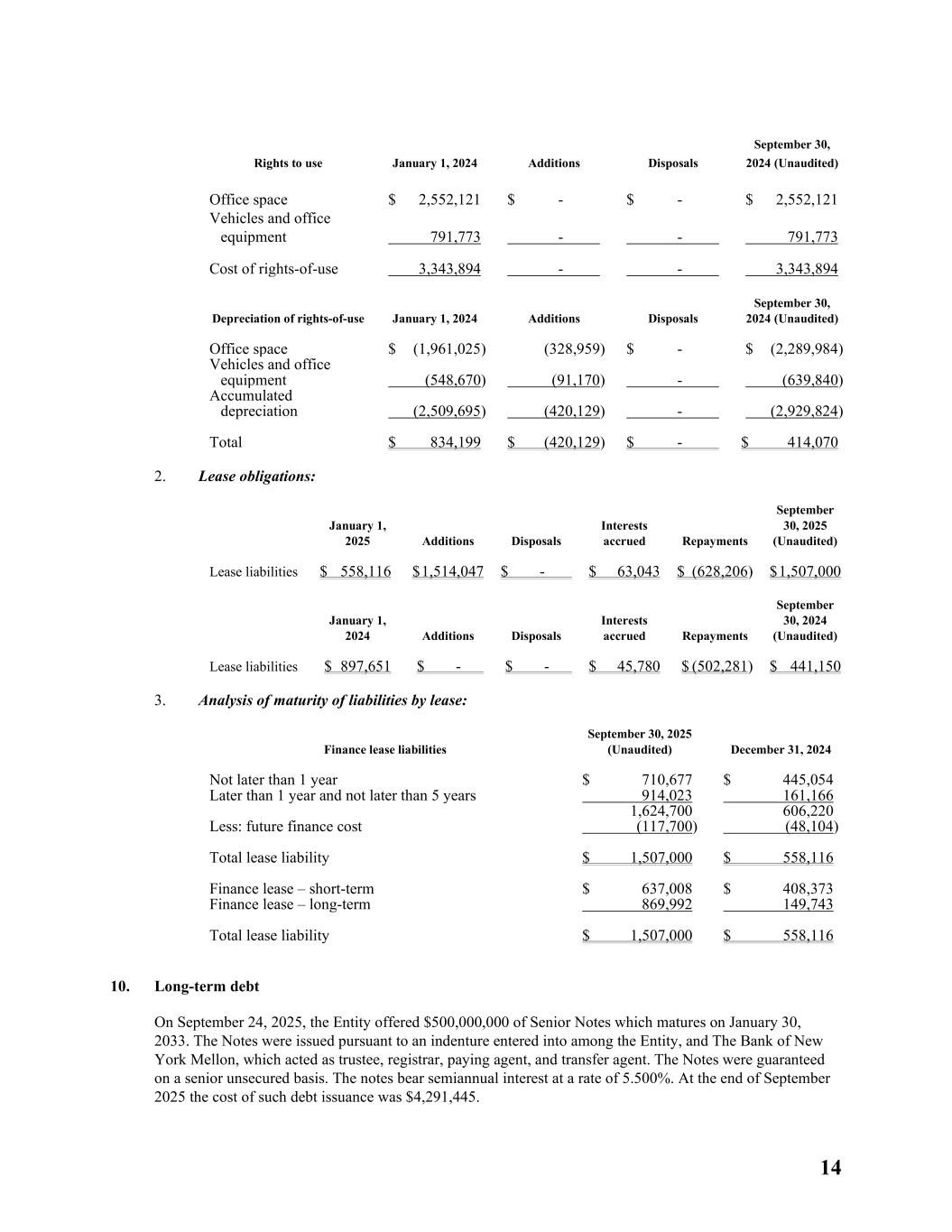 14 Rights to use January 1, 2024 Additions Disposals September 30, 2024 (Unaudited) Office space $ 2,552,121 $ - $ - $ 2,552,121 Vehicles and office equipment 791,773 - - 791,773 Cost of rights-of-use 3,343,894 - - 3,343,894 Depreciation of rights-of-use January 1, 2024 Additions Disposals September 30, 2024 (Unaudited) Office space $ (1,961,025) (328,959) $ - $ (2,289,984) Vehicles and office equipment (548,670) (91,170) - (639,840) Accumulated depreciation (2,509,695) (420,129) - (2,929,824) Total $ 834,199 $ (420,129) $ - $ 414,070 2. Lease obligations: January 1, 2025 Additions Disposals Interests accrued Repayments September 30, 2025 (Unaudited) Lease liabilities $ 558,116 $ 1,514,047 $ - $ 63,043 $ (628,206) $ 1,507,000 January 1, 2024 Additions Disposals Interests accrued Repayments September 30, 2024 (Unaudited) Lease liabilities $ 897,651 $ - $ - $ 45,780 $ (502,281) $ 441,150 3. Analysis of maturity of liabilities by lease: Finance lease liabilities September 30, 2025 (Unaudited) December 31, 2024 Not later than 1 year $ 710,677 $ 445,054 Later than 1 year and not later than 5 years 914,023 161,166 1,624,700 606,220 Less: future finance cost (117,700) (48,104) Total lease liability $ 1,507,000 $ 558,116 Finance lease – short-term $ 637,008 $ 408,373 Finance lease – long-term 869,992 149,743 Total lease liability $ 1,507,000 $ 558,116 10. Long-term debt On September 24, 2025, the Entity offered $500,000,000 of Senior Notes which matures on January 30, 2033. The Notes were issued pursuant to an indenture entered into among the Entity, and The Bank of New York Mellon, which acted as trustee, registrar, paying agent, and transfer agent. The Notes were guaranteed on a senior unsecured basis. The notes bear semiannual interest at a rate of 5.500%. At the end of September 2025 the cost of such debt issuance was $4,291,445.