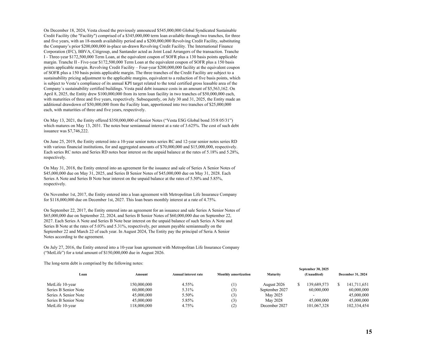15 On December 18, 2024, Vesta closed the previously announced $545,000,000 Global Syndicated Sustainable Credit Facility (the "Facility") comprised of a $345,000,000 term loan available through two tranches, for three and five years, with an 18-month availability period and a $200,000,000 Revolving Credit Facility, substituting the Company’s prior $200,000,000 in-place un-drawn Revolving Credit Facility. The International Finance Corporation (IFC), BBVA, Citigroup, and Santander acted as Joint Lead Arrangers of the transaction. Tranche I - Three-year $172,500,000 Term Loan, at the equivalent coupon of SOFR plus a 130 basis points applicable margin. Tranche II - Five-year $172,500,000 Term Loan at the equivalent coupon of SOFR plus a 150 basis points applicable margin. Revolving Credit Facility – Four-year $200,000,000 facility at the equivalent coupon of SOFR plus a 150 basis points applicable margin. The three tranches of the Credit Facility are subject to a sustainability pricing adjustment to the applicable margins, equivalent to a reduction of five basis points, which is subject to Vesta’s compliance of its annual KPI target related to the total certified gross leasable area of the Company´s sustainability certified buildings. Vesta paid debt issuance costs in an amount of $5,563,162. On April 8, 2025, the Entity drew $100,000,000 from its term loan facility in two tranches of $50,000,000 each, with maturities of three and five years, respectively. Subsequently, on July 30 and 31, 2025, the Entity made an additional drawdown of $50,000,000 from the Facility loan, apportioned into two tranches of $25,000,000 each, with maturities of three and five years, respectively. On May 13, 2021, the Entity offered $350,000,000 of Senior Notes (“Vesta ESG Global bond 35/8 05/31”) which matures on May 13, 2031. The notes bear semiannual interest at a rate of 3.625%. The cost of such debt issuance was $7,746,222. On June 25, 2019, the Entity entered into a 10-year senior notes series RC and 12-year senior notes series RD with various financial institutions, for and aggregated amounts of $70,000,000 and $15,000,000, respectively. Each series RC notes and Series RD notes bear interest on the unpaid balance at the rates of 5.18% and 5.28%, respectively. On May 31, 2018, the Entity entered into an agreement for the issuance and sale of Series A Senior Notes of $45,000,000 due on May 31, 2025, and Series B Senior Notes of $45,000,000 due on May 31, 2028. Each Series A Note and Series B Note bear interest on the unpaid balance at the rates of 5.50% and 5.85%, respectively. On November 1st, 2017, the Entity entered into a loan agreement with Metropolitan Life Insurance Company for $118,000,000 due on December 1st, 2027. This loan bears monthly interest at a rate of 4.75%. On September 22, 2017, the Entity entered into an agreement for an issuance and sale Series A Senior Notes of $65,000,000 due on September 22, 2024, and Series B Senior Notes of $60,000,000 due on September 22, 2027. Each Series A Note and Series B Note bear interest on the unpaid balance of such Series A Note and Series B Note at the rates of 5.03% and 5.31%, respectively, per annum payable semiannually on the September 22 and March 22 of each year. In August 2024, The Entity pay the principal of Seria A Senior Notes according to the agreement. On July 27, 2016, the Entity entered into a 10-year loan agreement with Metropolitan Life Insurance Company (“MetLife”) for a total amount of $150,000,000 due in August 2026. The long-term debt is comprised by the following notes: Loan Amount Annual interest rate Monthly amortization Maturity September 30, 2025 (Unaudited) December 31, 2024 MetLife 10-year 150,000,000 4.55% (1) August 2026 $ 139,689,573 $ 141,711,651 Series B Senior Note 60,000,000 5.31% (3) September 2027 60,000,000 60,000,000 Series A Senior Note 45,000,000 5.50% (3) May 2025 - 45,000,000 Series B Senior Note 45,000,000 5.85% (3) May 2028 45,000,000 45,000,000 MetLife 10-year 118,000,000 4.75% (2) December 2027 101,067,328 102,334,454