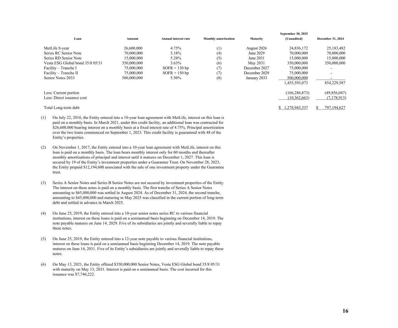 16 Loan Amount Annual interest rate Monthly amortization Maturity September 30, 2025 (Unaudited) December 31, 2024 MetLife 8-year 26,600,000 4.75% (1) August 2026 24,836,172 25,183,482 Series RC Senior Note 70,000,000 5.18% (4) June 2029 70,000,000 70,000,000 Series RD Senior Note 15,000,000 5.28% (5) June 2031 15,000,000 15,000,000 Vesta ESG Global bond 35/8 05/31 350,000,000 3.63% (6) May 2031 350,000,000 350,000,000 Facility – Tranche I 75,000,000 SOFR + 130 bp (7) December 2027 75,000,000 - Facility – Tranche II 75,000,000 SOFR + 150 bp (7) December 2029 75,000,000 - Senior Notes 2033 500,000,000 5.50% (8) January 2033 500,000,000 - 1,455,593,073 854,229,587 Less: Current portion (166,286,873) (49,856,047) Less: Direct issuance cost (10,362,663) (7,178,913) Total Long-term debt $ 1,278,943,537 $ 797,194,627 (1) On July 22, 2016, the Entity entered into a 10-year loan agreement with MetLife, interest on this loan is paid on a monthly basis. In March 2021, under this credit facility, an additional loan was contracted for $26,600,000 bearing interest on a monthly basis at a fixed interest rate of 4.75%. Principal amortization over the two loans commenced on September 1, 2023. This credit facility is guaranteed with 48 of the Entity’s properties. (2) On November 1, 2017, the Entity entered into a 10-year loan agreement with MetLife, interest on this loan is paid on a monthly basis. The loan bears monthly interest only for 60 months and thereafter monthly amortizations of principal and interest until it matures on December 1, 2027. This loan is secured by 19 of the Entity’s investment properties under a Guarantee Trust. On November 28, 2023, the Entity prepaid $12,194,600 associated with the sale of one investment property under the Guarantee trust. (3) Series A Senior Notes and Series B Senior Notes are not secured by investment properties of the Entity. The interest on these notes is paid on a monthly basis. The first tranche of Series A Senior Notes amounting to $65,000,000 was settled in August 2024. As of December 31, 2024, the second tranche, amounting to $45,000,000 and maturing in May 2025 was classified in the current portion of long-term debt and settled in advance in March 2025. (4) On June 25, 2019, the Entity entered into a 10-year senior notes series RC to various financial institutions, interest on these loans is paid on a semiannual basis beginning on December 14, 2019. The note payable matures on June 14, 2029. Five of its subsidiaries are jointly and severally liable to repay these notes. (5) On June 25, 2019, the Entity entered into a 12-year note payable to various financial institutions, interest on these loans is paid on a semiannual basis beginning December 14, 2019. The note payable matures on June 14, 2031. Five of its Entity’s subsidiaries are jointly and severally liable to repay these notes. (6) On May 13, 2021, the Entity offered $350,000,000 Senior Notes, Vesta ESG Global bond 35/8 05/31 with maturity on May 13, 2031. Interest is paid on a semiannual basis. The cost incurred for this issuance was $7,746,222.