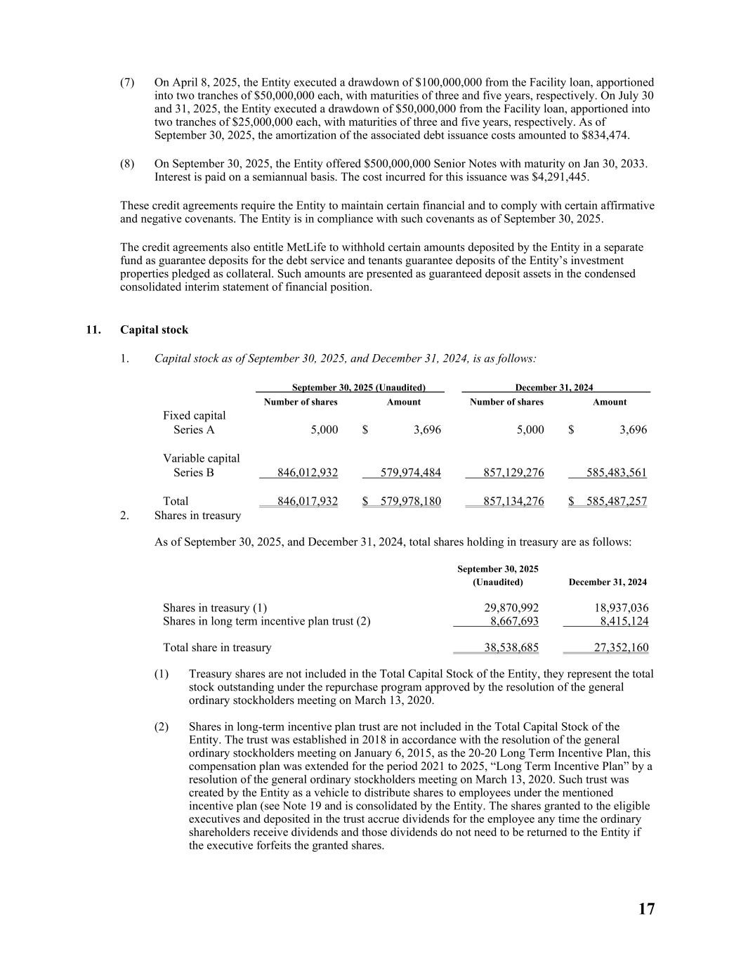 17 (7) On April 8, 2025, the Entity executed a drawdown of $100,000,000 from the Facility loan, apportioned into two tranches of $50,000,000 each, with maturities of three and five years, respectively. On July 30 and 31, 2025, the Entity executed a drawdown of $50,000,000 from the Facility loan, apportioned into two tranches of $25,000,000 each, with maturities of three and five years, respectively. As of September 30, 2025, the amortization of the associated debt issuance costs amounted to $834,474. (8) On September 30, 2025, the Entity offered $500,000,000 Senior Notes with maturity on Jan 30, 2033. Interest is paid on a semiannual basis. The cost incurred for this issuance was $4,291,445. These credit agreements require the Entity to maintain certain financial and to comply with certain affirmative and negative covenants. The Entity is in compliance with such covenants as of September 30, 2025. The credit agreements also entitle MetLife to withhold certain amounts deposited by the Entity in a separate fund as guarantee deposits for the debt service and tenants guarantee deposits of the Entity’s investment properties pledged as collateral. Such amounts are presented as guaranteed deposit assets in the condensed consolidated interim statement of financial position. 11. Capital stock 1. Capital stock as of September 30, 2025, and December 31, 2024, is as follows: September 30, 2025 (Unaudited) December 31, 2024 Number of shares Amount Number of shares Amount Fixed capital Series A 5,000 $ 3,696 5,000 $ 3,696 Variable capital Series B 846,012,932 579,974,484 857,129,276 585,483,561 Total 846,017,932 $ 579,978,180 857,134,276 $ 585,487,257 2. Shares in treasury As of September 30, 2025, and December 31, 2024, total shares holding in treasury are as follows: September 30, 2025 (Unaudited) December 31, 2024 Shares in treasury (1) 29,870,992 18,937,036 Shares in long term incentive plan trust (2) 8,667,693 8,415,124 Total share in treasury 38,538,685 27,352,160 (1) Treasury shares are not included in the Total Capital Stock of the Entity, they represent the total stock outstanding under the repurchase program approved by the resolution of the general ordinary stockholders meeting on March 13, 2020. (2) Shares in long-term incentive plan trust are not included in the Total Capital Stock of the Entity. The trust was established in 2018 in accordance with the resolution of the general ordinary stockholders meeting on January 6, 2015, as the 20-20 Long Term Incentive Plan, this compensation plan was extended for the period 2021 to 2025, “Long Term Incentive Plan” by a resolution of the general ordinary stockholders meeting on March 13, 2020. Such trust was created by the Entity as a vehicle to distribute shares to employees under the mentioned incentive plan (see Note 19 and is consolidated by the Entity. The shares granted to the eligible executives and deposited in the trust accrue dividends for the employee any time the ordinary shareholders receive dividends and those dividends do not need to be returned to the Entity if the executive forfeits the granted shares.