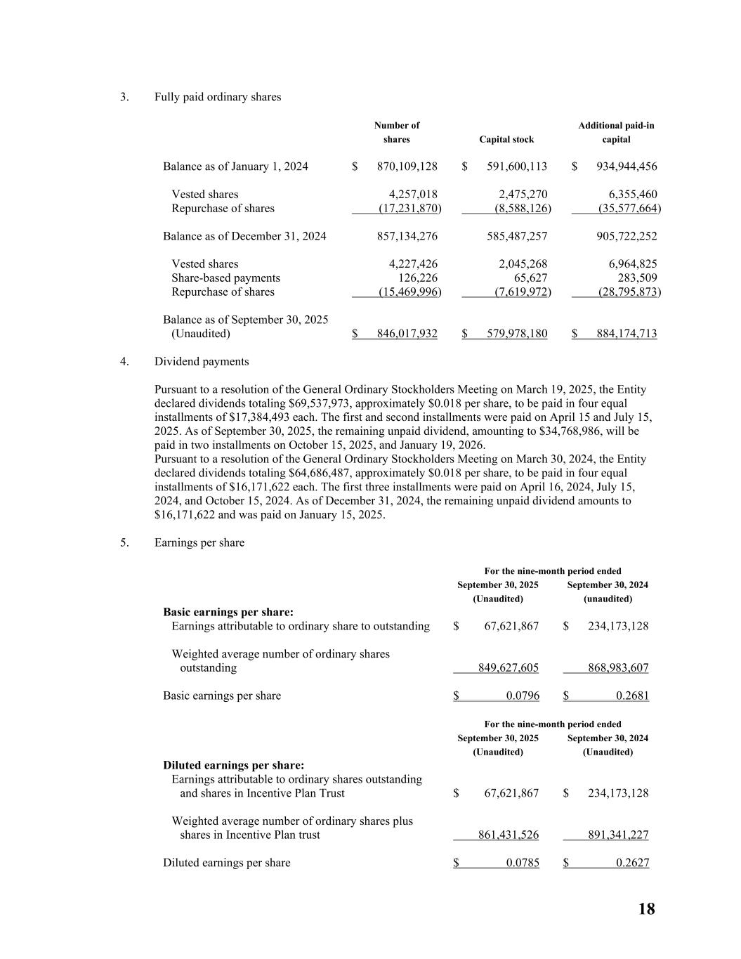 18 3. Fully paid ordinary shares Number of shares Capital stock Additional paid-in capital Balance as of January 1, 2024 $ 870,109,128 $ 591,600,113 $ 934,944,456 Vested shares 4,257,018 2,475,270 6,355,460 Repurchase of shares (17,231,870) (8,588,126) (35,577,664) Balance as of December 31, 2024 857,134,276 585,487,257 905,722,252 Vested shares 4,227,426 2,045,268 6,964,825 Share-based payments 126,226 65,627 283,509 Repurchase of shares (15,469,996) (7,619,972) (28,795,873) Balance as of September 30, 2025 (Unaudited) $ 846,017,932 $ 579,978,180 $ 884,174,713 4. Dividend payments Pursuant to a resolution of the General Ordinary Stockholders Meeting on March 19, 2025, the Entity declared dividends totaling $69,537,973, approximately $0.018 per share, to be paid in four equal installments of $17,384,493 each. The first and second installments were paid on April 15 and July 15, 2025. As of September 30, 2025, the remaining unpaid dividend, amounting to $34,768,986, will be paid in two installments on October 15, 2025, and January 19, 2026. Pursuant to a resolution of the General Ordinary Stockholders Meeting on March 30, 2024, the Entity declared dividends totaling $64,686,487, approximately $0.018 per share, to be paid in four equal installments of $16,171,622 each. The first three installments were paid on April 16, 2024, July 15, 2024, and October 15, 2024. As of December 31, 2024, the remaining unpaid dividend amounts to $16,171,622 and was paid on January 15, 2025. 5. Earnings per share For the nine-month period ended September 30, 2025 (Unaudited) September 30, 2024 (unaudited) Basic earnings per share: Earnings attributable to ordinary share to outstanding $ 67,621,867 $ 234,173,128 Weighted average number of ordinary shares outstanding 849,627,605 868,983,607 Basic earnings per share $ 0.0796 $ 0.2681 For the nine-month period ended September 30, 2025 (Unaudited) September 30, 2024 (Unaudited) Diluted earnings per share: Earnings attributable to ordinary shares outstanding and shares in Incentive Plan Trust $ 67,621,867 $ 234,173,128 Weighted average number of ordinary shares plus shares in Incentive Plan trust 861,431,526 891,341,227 Diluted earnings per share $ 0.0785 $ 0.2627