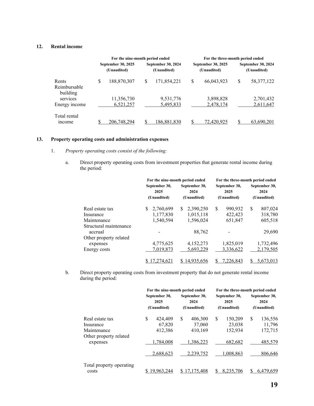 19 12. Rental income For the nine-month period ended For the three-month period ended September 30, 2025 (Unaudited) September 30, 2024 (Unaudited) September 30, 2025 (Unaudited) September 30, 2024 (Unaudited) Rents $ 188,870,307 $ 171,854,221 $ 66,043,923 $ 58,377,122 Reimbursable building services 11,356,730 9,531,776 3,898,828 2,701,432 Energy income 6,521,257 5,495,833 2,478,174 2,611,647 Total rental income $ 206,748,294 $ 186,881,830 $ 72,420,925 $ 63,690,201 13. Property operating costs and administration expenses 1. Property operating costs consist of the following: a. Direct property operating costs from investment properties that generate rental income during the period: For the nine-month period ended For the three-month period ended September 30, 2025 (Unaudited) September 30, 2024 (Unaudited) September 30, 2025 (Unaudited) September 30, 2024 (Unaudited) Real estate tax $ 2,760,699 $ 2,390,250 $ 990,932 $ 807,024 Insurance 1,177,830 1,015,118 422,423 318,780 Maintenance 1,540,594 1,596,024 651,847 605,518 Structural maintenance accrual - 88,762 - 29,690 Other property related expenses 4,775,625 4,152,273 1,825,019 1,732,496 Energy costs 7,019,873 5,693,229 3,336,622 2,179,505 $ 17,274,621 $ 14,935,656 $ 7,226,843 $ 5,673,013 b. Direct property operating costs from investment property that do not generate rental income during the period: For the nine-month period ended For the three-month period ended September 30, 2025 (Unaudited) September 30, 2024 (Unaudited) September 30, 2025 (Unaudited) September 30, 2024 (Unaudited) Real estate tax $ 424,409 $ 406,300 $ 150,209 $ 136,556 Insurance 67,820 37,060 23,038 11,796 Maintenance 412,386 410,169 152,934 172,715 Other property related expenses 1,784,008 1,386,223 682,682 485,579 2,688,623 2,239,752 1,008,863 806,646 Total property operating costs $ 19,963,244 $ 17,175,408 $ 8,235,706 $ 6,479,659