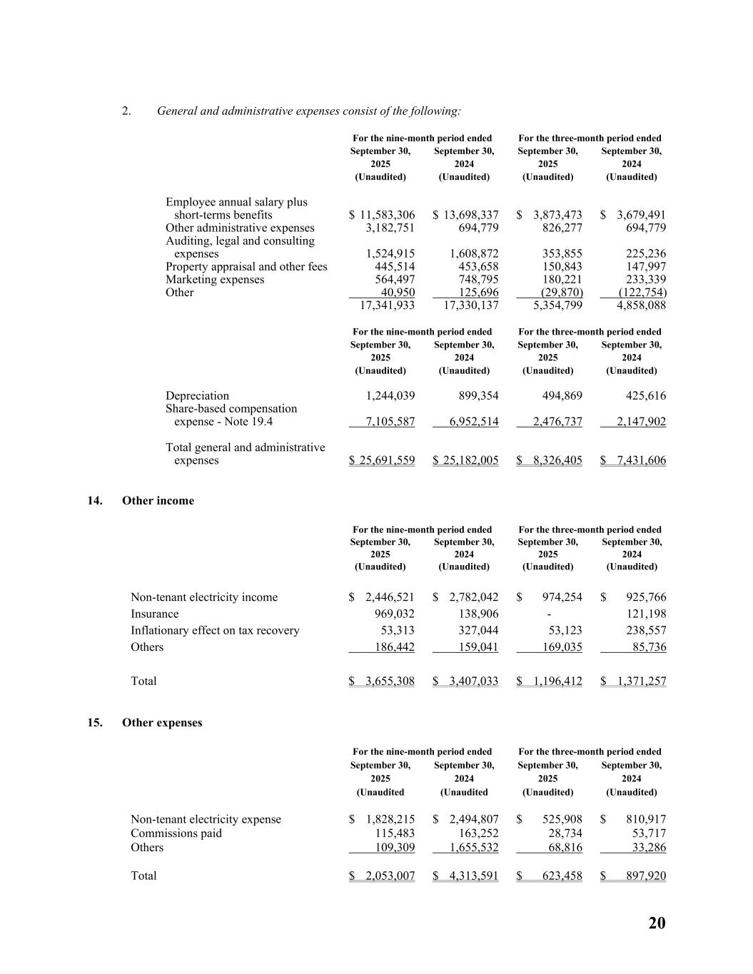20 2. General and administrative expenses consist of the following: For the nine-month period ended For the three-month period ended September 30, 2025 (Unaudited) September 30, 2024 (Unaudited) September 30, 2025 (Unaudited) September 30, 2024 (Unaudited) Employee annual salary plus short-terms benefits $ 11,583,306 $ 13,698,337 $ 3,873,473 $ 3,679,491 Other administrative expenses 3,182,751 694,779 826,277 694,779 Auditing, legal and consulting expenses 1,524,915 1,608,872 353,855 225,236 Property appraisal and other fees 445,514 453,658 150,843 147,997 Marketing expenses 564,497 748,795 180,221 233,339 Other 40,950 125,696 (29,870) (122,754) 17,341,933 17,330,137 5,354,799 4,858,088 For the nine-month period ended For the three-month period ended September 30, 2025 (Unaudited) September 30, 2024 (Unaudited) September 30, 2025 (Unaudited) September 30, 2024 (Unaudited) Depreciation 1,244,039 899,354 494,869 425,616 Share-based compensation expense - Note 19.4 7,105,587 6,952,514 2,476,737 2,147,902 Total general and administrative expenses $ 25,691,559 $ 25,182,005 $ 8,326,405 $ 7,431,606 14. Other income For the nine-month period ended For the three-month period ended September 30, 2025 (Unaudited) September 30, 2024 (Unaudited) September 30, 2025 (Unaudited) September 30, 2024 (Unaudited) Non-tenant electricity income $ 2,446,521 $ 2,782,042 $ 974,254 $ 925,766 Insurance 969,032 138,906 - 121,198 Inflationary effect on tax recovery 53,313 327,044 53,123 238,557 Others 186,442 159,041 169,035 85,736 Total $ 3,655,308 $ 3,407,033 $ 1,196,412 $ 1,371,257 15. Other expenses For the nine-month period ended For the three-month period ended September 30, 2025 (Unaudited September 30, 2024 (Unaudited September 30, 2025 (Unaudited) September 30, 2024 (Unaudited) Non-tenant electricity expense $ 1,828,215 $ 2,494,807 $ 525,908 $ 810,917 Commissions paid 115,483 163,252 28,734 53,717 Others 109,309 1,655,532 68,816 33,286 Total $ 2,053,007 $ 4,313,591 $ 623,458 $ 897,920