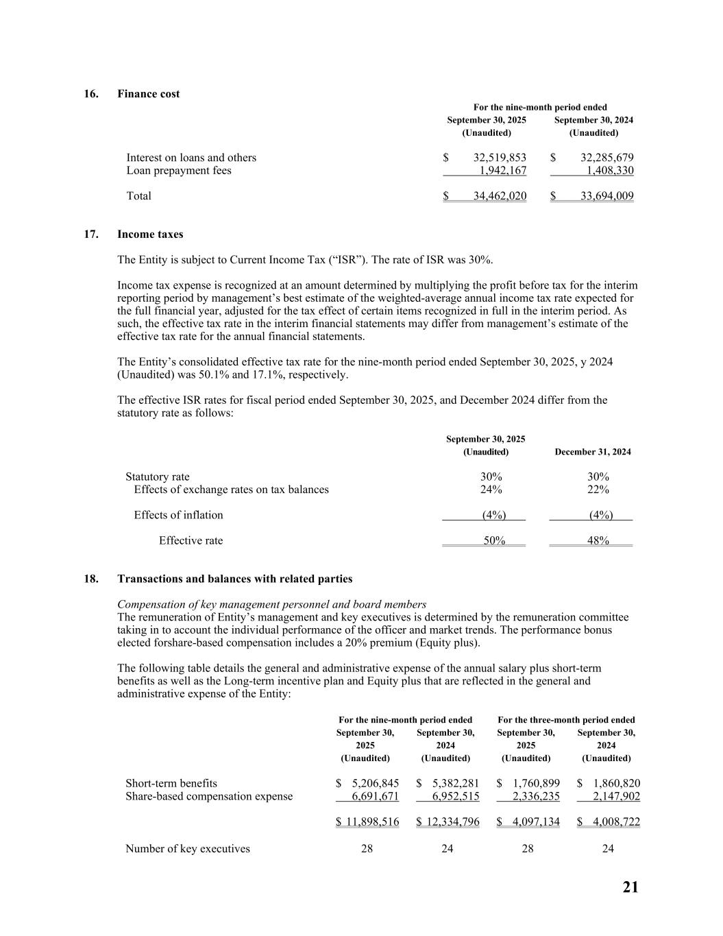 21 16. Finance cost For the nine-month period ended September 30, 2025 (Unaudited) September 30, 2024 (Unaudited) Interest on loans and others $ 32,519,853 $ 32,285,679 Loan prepayment fees 1,942,167 1,408,330 Total $ 34,462,020 $ 33,694,009 17. Income taxes The Entity is subject to Current Income Tax (“ISR”). The rate of ISR was 30%. Income tax expense is recognized at an amount determined by multiplying the profit before tax for the interim reporting period by management’s best estimate of the weighted-average annual income tax rate expected for the full financial year, adjusted for the tax effect of certain items recognized in full in the interim period. As such, the effective tax rate in the interim financial statements may differ from management’s estimate of the effective tax rate for the annual financial statements. The Entity’s consolidated effective tax rate for the nine-month period ended September 30, 2025, y 2024 (Unaudited) was 50.1% and 17.1%, respectively. The effective ISR rates for fiscal period ended September 30, 2025, and December 2024 differ from the statutory rate as follows: September 30, 2025 (Unaudited) December 31, 2024 Statutory rate 30% 30% Effects of exchange rates on tax balances 24% 22% Effects of inflation (4%) (4%) Effective rate 50% 48% 18. Transactions and balances with related parties Compensation of key management personnel and board members The remuneration of Entity’s management and key executives is determined by the remuneration committee taking in to account the individual performance of the officer and market trends. The performance bonus elected forshare-based compensation includes a 20% premium (Equity plus). The following table details the general and administrative expense of the annual salary plus short-term benefits as well as the Long-term incentive plan and Equity plus that are reflected in the general and administrative expense of the Entity: For the nine-month period ended For the three-month period ended September 30, 2025 (Unaudited) September 30, 2024 (Unaudited) September 30, 2025 (Unaudited) September 30, 2024 (Unaudited) Short-term benefits $ 5,206,845 $ 5,382,281 $ 1,760,899 $ 1,860,820 Share-based compensation expense 6,691,671 6,952,515 2,336,235 2,147,902 $ 11,898,516 $ 12,334,796 $ 4,097,134 $ 4,008,722 Number of key executives 28 24 28 24