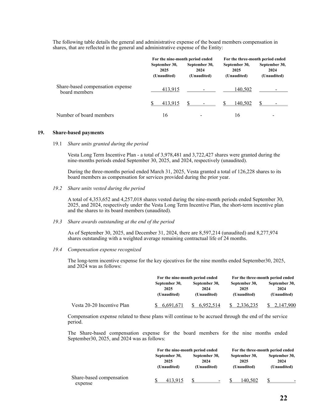 22 The following table details the general and administrative expense of the board members compensation in shares, that are reflected in the general and administrative expense of the Entity: For the nine-month period ended For the three-month period ended September 30, 2025 (Unaudited) September 30, 2024 (Unaudited) September 30, 2025 (Unaudited) September 30, 2024 (Unaudited) Share-based compensation expense board members 413,915 - 140,502 - $ 413,915 $ - $ 140,502 $ - Number of board members 16 - 16 - 19. Share-based payments 19.1 Share units granted during the period Vesta Long Term Incentive Plan - a total of 3,978,481 and 3,722,427 shares were granted during the nine-months periods ended September 30, 2025, and 2024, respectively (unaudited). During the three-months period ended March 31, 2025, Vesta granted a total of 126,228 shares to its board members as compensation for services provided during the prior year. 19.2 Share units vested during the period A total of 4,353,652 and 4,257,018 shares vested during the nine-month periods ended September 30, 2025, and 2024, respectively under the Vesta Long Term Incentive Plan, the short-term incentive plan and the shares to its board members (unaudited). 19.3 Share awards outstanding at the end of the period As of September 30, 2025, and December 31, 2024, there are 8,597,214 (unaudited) and 8,277,974 shares outstanding with a weighted average remaining contractual life of 24 months. 19.4 Compensation expense recognized The long-term incentive expense for the key ejecutives for the nine months ended September30, 2025, and 2024 was as follows: For the nine-month period ended For the three-month period ended September 30, 2025 (Unaudited) September 30, 2024 (Unaudited) September 30, 2025 (Unaudited) September 30, 2024 (Unaudited) Vesta 20-20 Incentive Plan $ 6,691,671 $ 6,952,514 $ 2,336,235 $ 2,147,900 Compensation expense related to these plans will continue to be accrued through the end of the service period. The Share-based compensation expense for the board members for the nine months ended September30, 2025, and 2024 was as follows: For the nine-month period ended For the three-month period ended September 30, 2025 (Unaudited) September 30, 2024 (Unaudited) September 30, 2025 (Unaudited) September 30, 2024 (Unaudited) Share-based compensation expense $ 413,915 $ - $ 140,502 $ -
