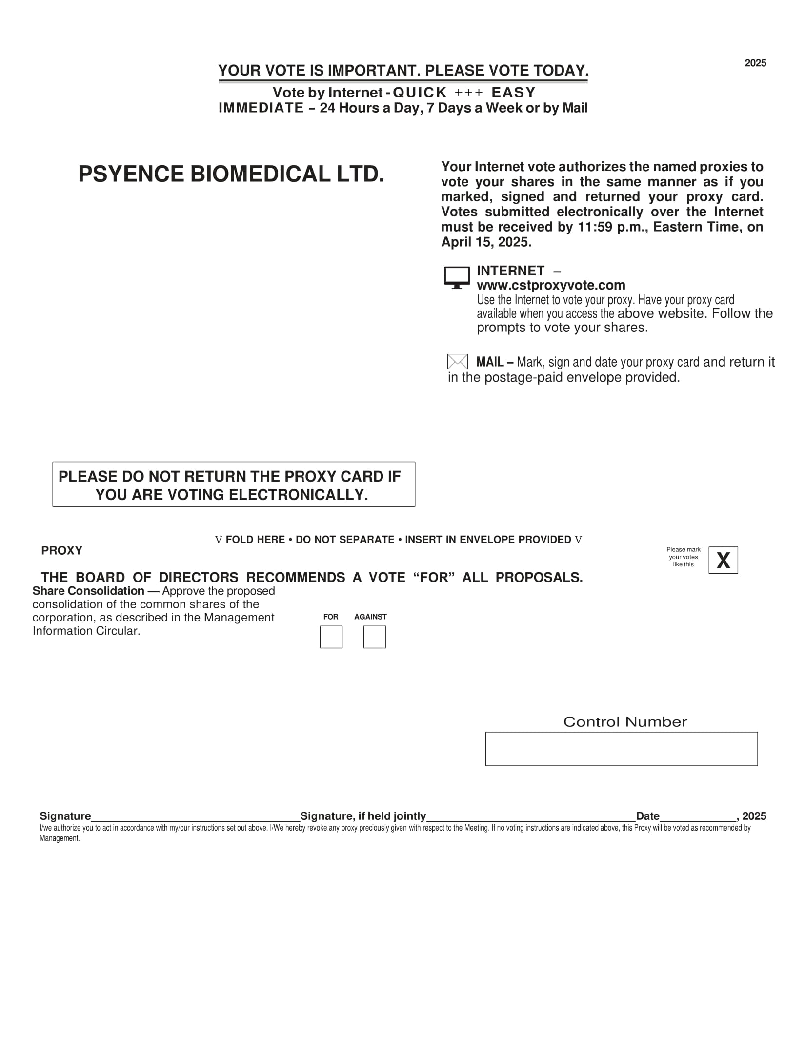 YOUR VOTE IS IMPORTANT. PLEASE VOTE TODAY. Vote by Internet - QUICK +++ EASY IMMEDIATE - 24 Hours a Day, 7 Days a Week or by Mail 2025 PSYENCE BIOMEDICAL LTD. Your Internet vote authorizes the named proxies to vote your shares in the same manner as if you marked, signed and returned your proxy card . Votes submitted electronically over the Internet must be received by 11 : 59 p . m . , Eastern Time, on April 15 , 2025 . INTERNET – www.cstproxyvote.com Use the Internet to vote your proxy. Have your proxy card available when you access the above website. Follow the prompts to vote your shares. MAIL – Mark, sign and date your proxy card and return it in the postage - paid envelope provided. PROXY V FOLD HERE • DO NOT SEPARATE • INSERT IN ENVELOPE PROVIDED V Please mark your votes like this THE BOARD OF DIRECTORS RECOMMENDS A VOTE “FOR” ALL PROPOSALS. Share Consolidation — Approve the proposed consolidation of the common shares of the corporation, as described in the Management Information Circular. FOR AGAINST Control Number Signature Signature, if held jointly Date , 2025 I/we authorize you to act in accordance with my/our instructions set out above. I/We hereby revoke any proxy preciously given with respect to the Meeting. If no voting instructions are indicated above, this Proxy will be voted as recommended by Management. PLEASE DO NOT RETURN THE PROXY CARD IF YOU ARE VOTING ELECTRONICALLY. X