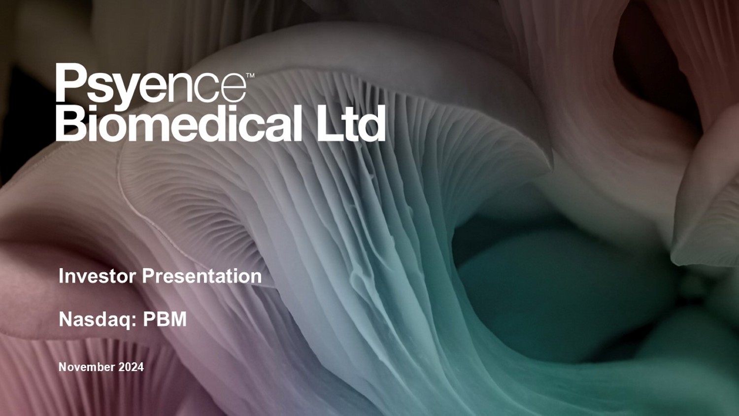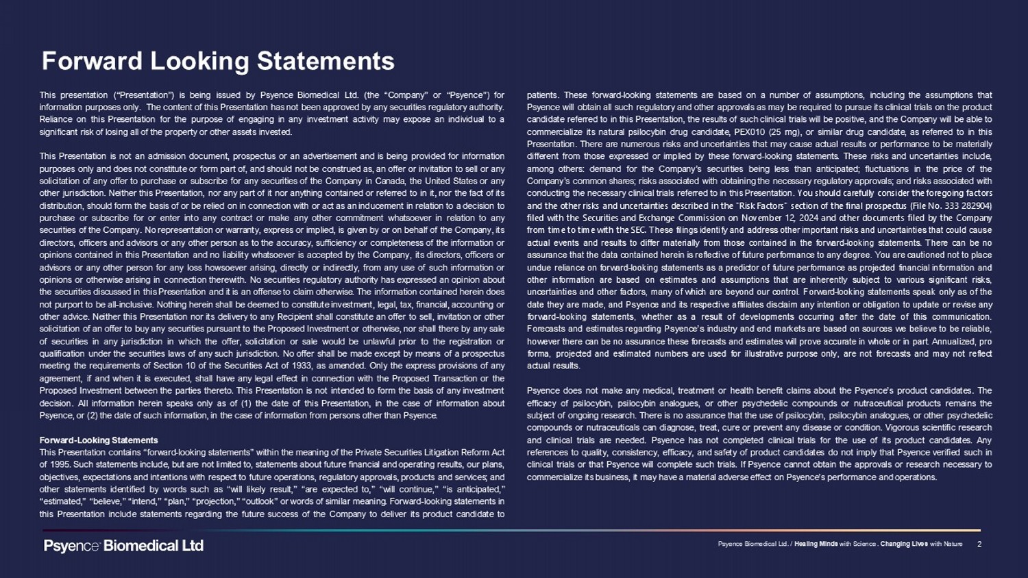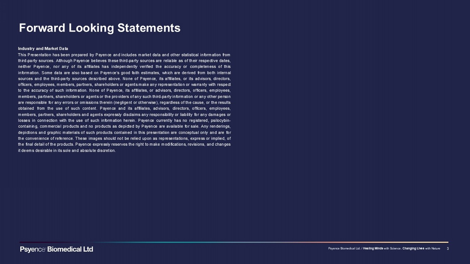 2 Psyence Biomedical Ltd. / Healing Minds with Science . Changing Lives with Nature This presentation (“Presentation”) is being issued by Psyence Biomedical Ltd . (the “Company” or “ Psyence ”) for information purposes only . The content of this Presentation has not been approved by any securities regulatory authority . Reliance on this Presentation for the purpose of engaging in any investment activity may expose an individual to a significant risk of losing all of the property or other assets invested . This Presentation is not an admission document, prospectus or an advertisement and is being provided for information purposes only and does not constitute or form part of, and should not be construed as, an offer or invitation to sell or any solicitation of any offer to purchase or subscribe for any securities of the Company in Canada, the United States or any other jurisdiction . Neither this Presentation, nor any part of it nor anything contained or referred to in it, nor the fact of its distribution, should form the basis of or be relied on in connection with or act as an inducement in relation to a decision to purchase or subscribe for or enter into any contract or make any other commitment whatsoever in relation to any securities of the Company . No representation or warranty, express or implied, is given by or on behalf of the Company, its directors, officers and advisors or any other person as to the accuracy, sufficiency or completeness of the information or opinions contained in this Presentation and no liability whatsoever is accepted by the Company, its directors, officers or advisors or any other person for any loss howsoever arising, directly or indirectly, from any use of such information or opinions or otherwise arising in connection therewith . No securities regulatory authority has expressed an opinion about the securities discussed in this Presentation and it is an offense to claim otherwise . The information contained herein does not purport to be all - inclusive . Nothing herein shall be deemed to constitute investment, legal, tax, financial, accounting or other advice . Neither this Presentation nor its delivery to any Recipient shall constitute an offer to sell, invitation or other solicitation of an offer to buy any securities pursuant to the Proposed Investment or otherwise, nor shall there by any sale of securities in any jurisdiction in which the offer, solicitation or sale would be unlawful prior to the registration or qualification under the securities laws of any such jurisdiction . No offer shall be made except by means of a prospectus meeting the requirements of Section 10 of the Securities Act of 1933 , as amended . Only the express provisions of any agreement, if and when it is executed, shall have any legal effect in connection with the Proposed Transaction or the Proposed Investment between the parties thereto . This Presentation is not intended to form the basis of any investment decision . All information herein speaks only as of ( 1 ) the date of this Presentation, in the case of information about Psyence , or ( 2 ) the date of such information, in the case of information from persons other than Psyence . Forward - Looking Statements This Presentation contains “forward - looking statements” within the meaning of the Private Securities Litigation Reform Act of 1995 . Such statements include, but are not limited to, statements about future financial and operating results, our plans, objectives, expectations and intentions with respect to future operations, regulatory approvals, products and services ; and other statements identified by words such as “will likely result,” “are expected to,” “will continue,” “is anticipated,” “estimated,” “believe,” “intend,” “plan,” “projection,” “outlook” or words of similar meaning . Forward - looking statements in this Presentation include statements regarding the future success of the Company to deliver its product candidate to patients . These forward - looking statements are based on a number of assumptions, including the assumptions that Psyence will obtain all such regulatory and other approvals as may be required to pursue its clinical trials on the product candidate referred to in this Presentation, the results of such clinical trials will be positive, and the Company will be able to commercialize its natural psilocybin drug candidate, PEX 010 ( 25 mg), or similar drug candidate, as referred to in this Presentation . There are numerous risks and uncertainties that may cause actual results or performance to be materially different from those expressed or implied by these forward - looking statements . These risks and uncertainties include, among others : demand for the Company’s securities being less than anticipated ; fluctuations in the price of the Company’s common shares ; risks associated with obtaining the necessary regulatory approvals ; and risks associated with conducting the necessary clinical trials referred to in this Presentation . You should carefully consider the foregoing factors and the other risks and uncertainties described in the "Risk Factors" section of the final prospectus (File No . 333 282904 ) filed with the Securities and Exchange Commission on November 12 , 2024 and other documents filed by the Company from time to time with the SEC . These filings identify and address other important risks and uncertainties that could cause actual events and results to differ materially from those contained in the forward - looking statements . There can be no assurance that the data contained herein is reflective of future performance to any degree . You are cautioned not to place undue reliance on forward - looking statements as a predictor of future performance as projected financial information and other information are based on estimates and assumptions that are inherently subject to various significant risks, uncertainties and other 