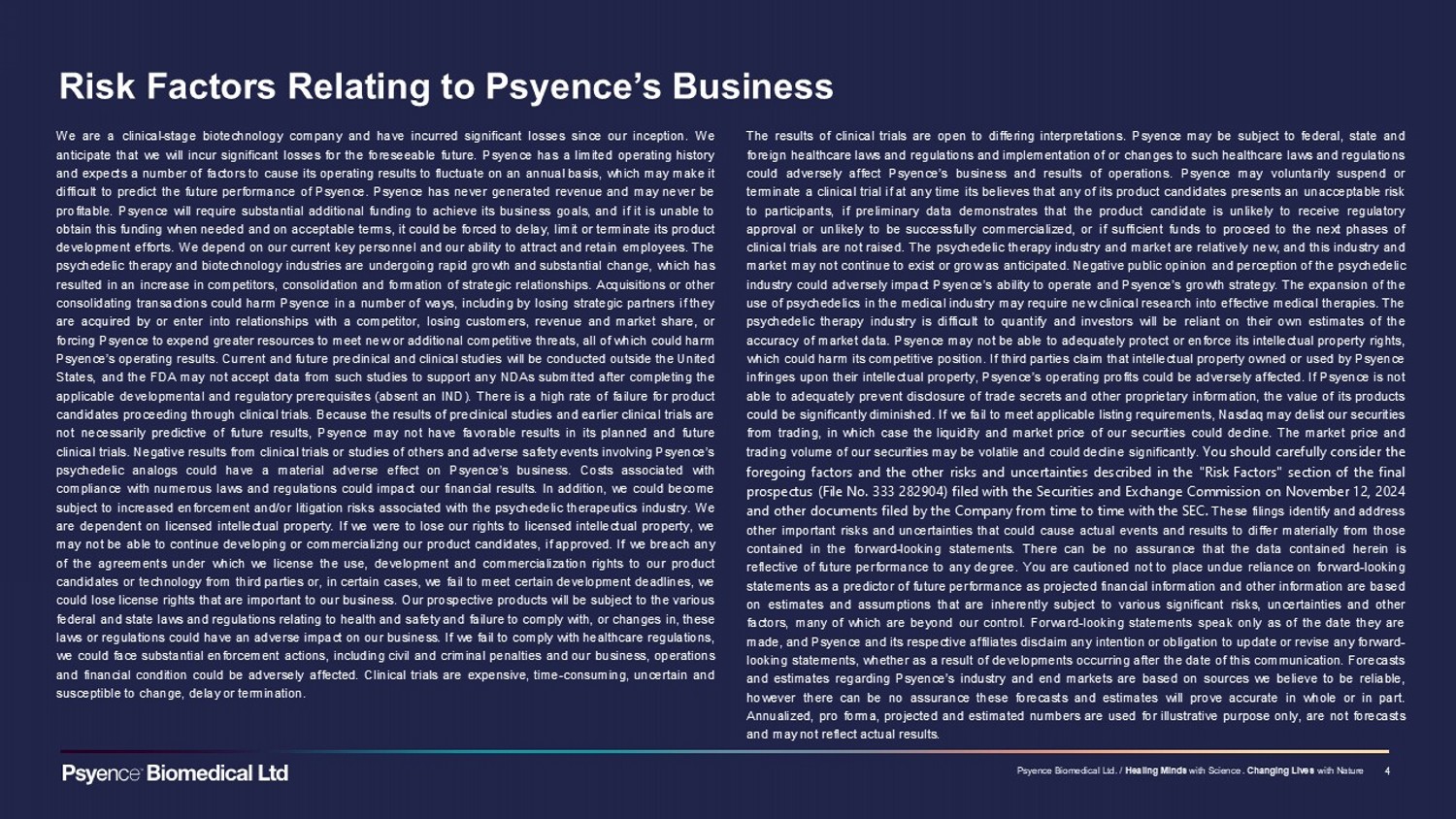 4 Psyence Biomedical Ltd. / Healing Minds with Science . Changing Lives with Nature We are a clinical - stage biotechnology company and have incurred significant losses since our inception . We anticipate that we will incur significant losses for the foreseeable future . Psyence has a limited operating history and expects a number of factors to cause its operating results to fluctuate on an annual basis, which may make it difficult to predict the future performance of Psyence . Psyence has never generated revenue and may never be profitable . Psyence will require substantial additional funding to achieve its business goals, and if it is unable to obtain this funding when needed and on acceptable terms, it could be forced to delay, limit or terminate its product development efforts . We depend on our current key personnel and our ability to attract and retain employees . The psychedelic therapy and biotechnology industries are undergoing rapid growth and substantial change, which has resulted in an increase in competitors, consolidation and formation of strategic relationships . Acquisitions or other consolidating transactions could harm Psyence in a number of ways, including by losing strategic partners if they are acquired by or enter into relationships with a competitor, losing customers, revenue and market share, or forcing Psyence to expend greater resources to meet new or additional competitive threats, all of which could harm Psyence’s operating results . Current and future preclinical and clinical studies will be conducted outside the United States, and the FDA may not accept data from such studies to support any NDAs submitted after completing the applicable developmental and regulatory prerequisites (absent an IND) . There is a high rate of failure for product candidates proceeding through clinical trials . Because the results of preclinical studies and earlier clinical trials are not necessarily predictive of future results, Psyence may not have favorable results in its planned and future clinical trials . Negative results from clinical trials or studies of others and adverse safety events involving Psyence’s psychedelic analogs could have a material adverse effect on Psyence’s business . Costs associated with compliance with numerous laws and regulations could impact our financial results . In addition, we could become subject to increased enforcement and/or litigation risks associated with the psychedelic therapeutics industry . We are dependent on licensed intellectual property . If we were to lose our rights to licensed intellectual property, we may not be able to continue developing or commercializing our product candidates, if approved . If we breach any of the agreements under which we license the use, development and commercialization rights to our product candidates or technology from third parties or, in certain cases, we fail to meet certain development deadlines, we could lose license rights that are important to our business . Our prospective products will be subject to the various federal and state laws and regulations relating to health and safety and failure to comply with, or changes in, these laws or regulations could have an adverse impact on our business . If we fail to comply with healthcare regulations, we could face substantial enforcement actions, including civil and criminal penalties and our business, operations and financial condition could be adversely affected . Clinical trials are expensive, time - consuming, uncertain and susceptible to change, delay or termination . The results of clinical trials are open to differing interpretations . Psyence may be subject to federal, state and foreign healthcare laws and regulations and implementation of or changes to such healthcare laws and regulations could adversely affect Psyence’s business and results of operations . Psyence may voluntarily suspend or terminate a clinical trial if at any time its believes that any of its product candidates presents an unacceptable risk to participants, if preliminary data demonstrates that the product candidate is unlikely to receive regulatory approval or unlikely to be successfully commercialized, or if sufficient funds to proceed to the next phases of clinical trials are not raised . The psychedelic therapy industry and market are relatively new, and this industry and market may not continue to exist or grow as anticipated . Negative public opinion and perception of the psychedelic industry could adversely impact Psyence’s ability to operate and Psyence’s growth strategy . The expansion of the use of psychedelics in the medical industry may require new clinical research into effective medical therapies . The psychedelic therapy industry is difficult to quantify and investors will be reliant on their own estimates of the accuracy of market data . Psyence may not be able to adequately protect or enforce its intellectual property rights, which could harm its competitive position . If third parties claim that intellectual property owned or used by Psyence infringes upon their intellectual property, Psyence’s operating profits could be adversely affected . If Psyence is not able to adequately prevent disclosure of trade secrets and other proprietary information, the value of its products could be significantly diminished . If we fail to meet applicable listing requirements, Nasdaq may delist our securities from trading, in which case the liquidity and market price of our securities could decline . The market price and trading volume of our securities may be volatile and could decline significantly . You should carefully consider the foregoing factors and the other risks and uncertainties described in the "Risk Factors" section of the final prospectus (File No . 333 282904 ) filed with the Securities and Exchange Commission on November 12 , 2024 and other documents filed by the Company from time to time with the SEC . These filings identify and address other i
