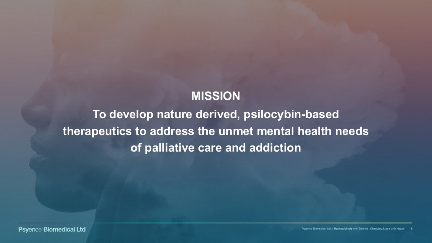 5 Psyence Biomedical Ltd. / Healing Minds with Science . Changing Lives with Nature MISSION To develop nature derived, psilocybin - based therapeutics to address the unmet mental health needs of palliative care and addiction