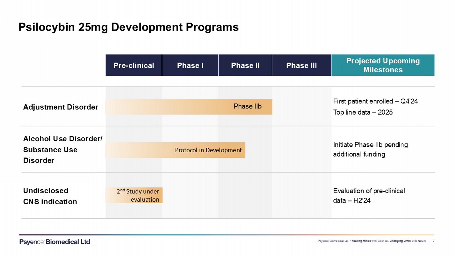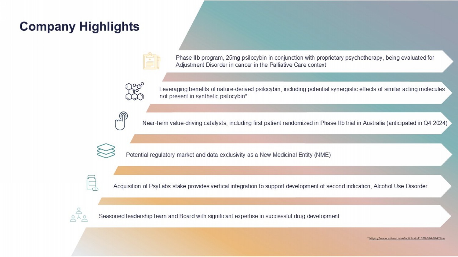 Company Highlights Phase IIb program, 25mg psilocybin in conjunction with proprietary psychotherapy, being evaluated for Adjustment Disorder in cancer in the Palliative Care context Near - term value - driving catalysts, including first patient randomized in Phase IIb trial in Australia (anticipated in Q4 2024) Leveraging benefits of nature - derived psilocybin, including potential synergistic effects of similar acting molecules not present in synthetic psilocybin* Seasoned leadership team and Board with significant expertise in successful drug development Potential regulatory market and data exclusivity as a New Medicinal Entity (NME) * https://www.nature.com/articles/s41380 - 024 - 02477 - w Acquisition of PsyLabs stake provides vertical integration to support development of second indication, Alcohol Use Disorder