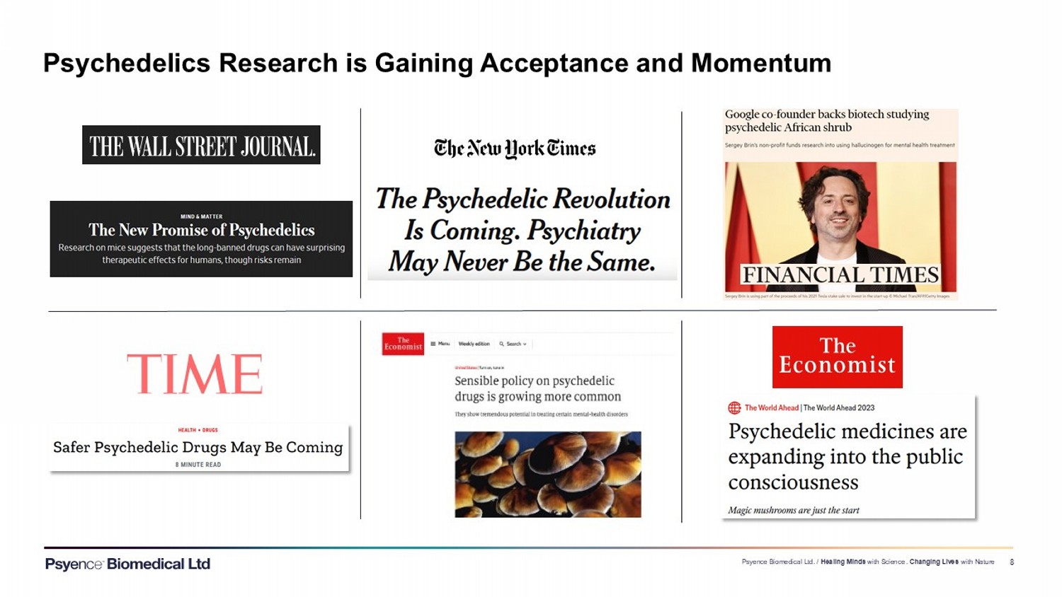 8 Psyence Biomedical Ltd. / Healing Minds with Science . Changing Lives with Nature Psychedelics Research is Gaining Acceptance and Momentum