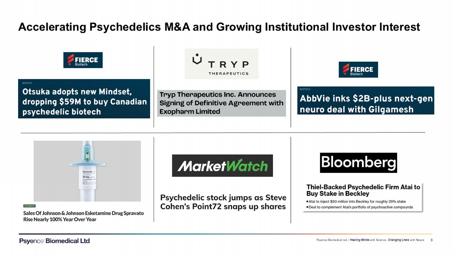 9 Psyence Biomedical Ltd. / Healing Minds with Science . Changing Lives with Nature Accelerating Psychedelics M&A and Growing Institutional Investor Interest