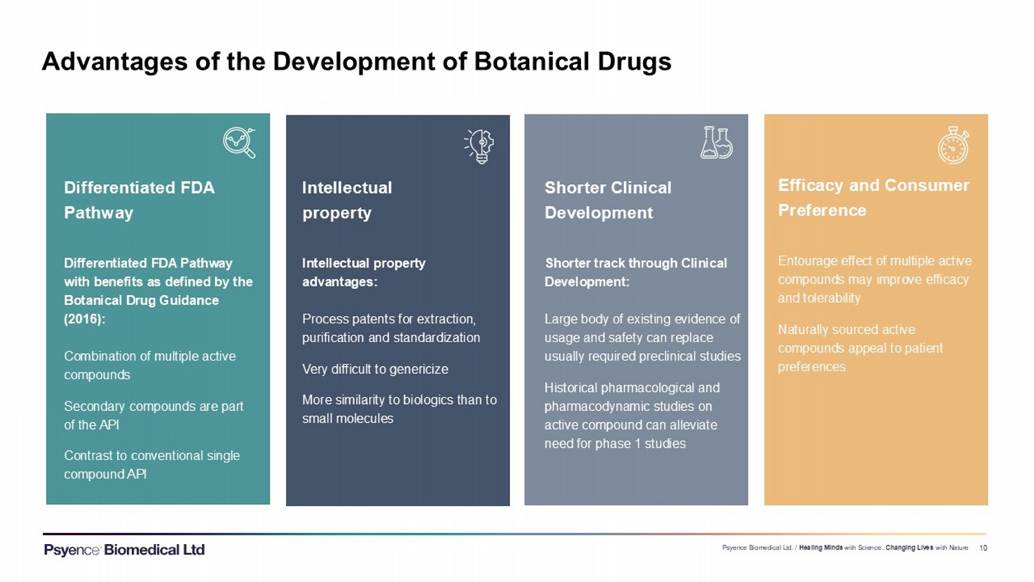 10 Psyence Biomedical Ltd. / Healing Minds with Science . Changing Lives with Nature Differentiated FDA Pathway Differentiated FDA Pathway with benefits as defined by the Botanical Drug Guidance (2016): Combination of multiple active compounds Secondary compounds are part of the API Contrast to conventional single compound API Intellectual property Intellectual property advantages: Process patents for extraction, purification and standardization Very difficult to genericize More similarity to biologics than to small molecules Shorter Clinical Development Shorter track through Clinical Development: Large body of existing evidence of usage and safety can replace usually required preclinical studies Historical pharmacological and pharmacodynamic studies on active compound can alleviate need for phase 1 studies Efficacy and Consumer Preference Entourage effect of multiple active compounds may improve efficacy and tolerability Naturally sourced active compounds appeal to patient preferences Advantages of the Development of Botanical Drugs