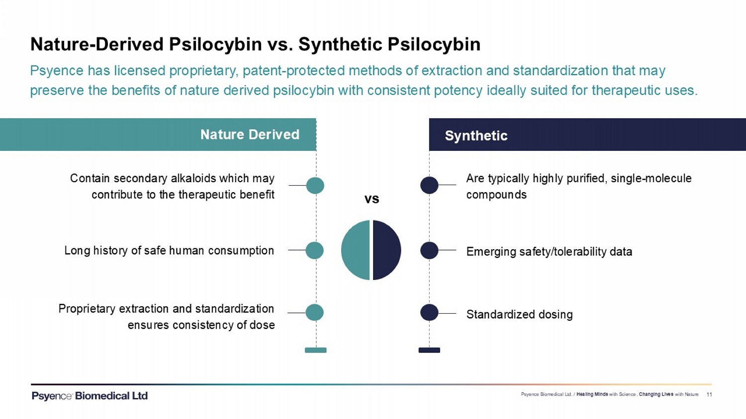 11 Psyence Biomedical Ltd. / Healing Minds with Science . Changing Lives with Nature Psyence has licensed proprietary, patent - protected methods of extraction and standardization that may preserve the benefits of nature derived psilocybin with consistent potency ideally suited for therapeutic uses. Nature - Derived Psilocybin vs. Synthetic Psilocybin Nature Derived Contain secondary alkaloids which may contribute to the therapeutic benefit Long history of safe human consumption Proprietary extraction and standardization ensures consistency of dose Synthetic Are typically highly purified, single - molecule compounds Emerging safety/tolerability data Standardized dosing vs