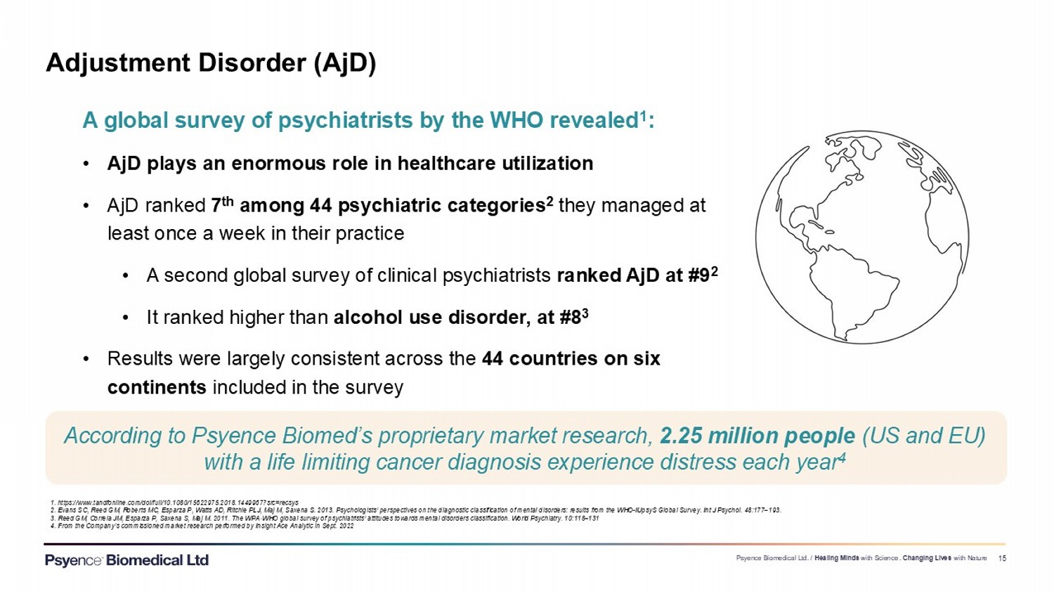 15 Psyence Biomedical Ltd. / Healing Minds with Science . Changing Lives with Nature *Source: https://www.nia.nih.gov/health/hospice - and - palliative - care/what - are - palliative - care - and - hospice - care Adjustment Disorder ( AjD ) 1. https://www.tandfonline.com/doi/full/10.1080/15622975.2018.1449967?src=recsys 2. Evans SC, Reed GM, Roberts MC, Esparza P, Watts AD, Ritchie PLJ, Maj M, Saxena S. 2013. Psychologists’ perspectives on the di agnostic classification of mental disorders: results from the WHO - IUpsyS Global Survey. Int J Psychol. 48:177 – 193. 3. Reed GM, Correia JM, Esparza P, Saxena S, Maj M. 2011. The WPA - WHO global survey of psychiatrists’ attitudes towards mental disorders classification. World Psychiatry. 10:118 – 131 4. From the Company’s commissioned market research performed by Insight Ace Analytic in Sept. 2022 A global survey of psychiatrists by the WHO revealed 1 : • AjD plays an enormous role in healthcare utilization • AjD ranked 7 th among 44 psychiatric categories 2 they managed at least once a week in their practice • A second global survey of clinical psychiatrists ranked AjD at #9 2 • It ranked higher than alcohol use disorder, at #8 3 • Results were largely consistent across the 44 countries on six continents included in the survey According to Psyence Biomed’s proprietary market research, 2.25 million people (US and EU) with a life limiting cancer diagnosis experience distress each year 4