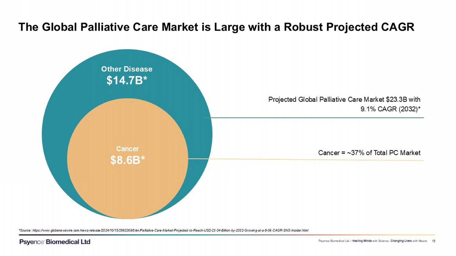 16 Psyence Biomedical Ltd. / Healing Minds with Science . Changing Lives with Nature *Source: https://www.globenewswire.com/news - release/2024/10/15/2963268/0/en/Palliative - Care - Market - Projected - to - Reach - USD - 23 - 34 - Billion - by - 2032 - Growing - at - a - 9 - 06 - CAGR - SNS - Insider.html Projected Global Palliative Care Market $23.3B with 9.1% CAGR (2032)* The Global Palliative Care Market is Large with a Robust Projected CAGR Other Disease $14.7B* Cancer $8.6B* Cancer = ~37% of Total PC Market