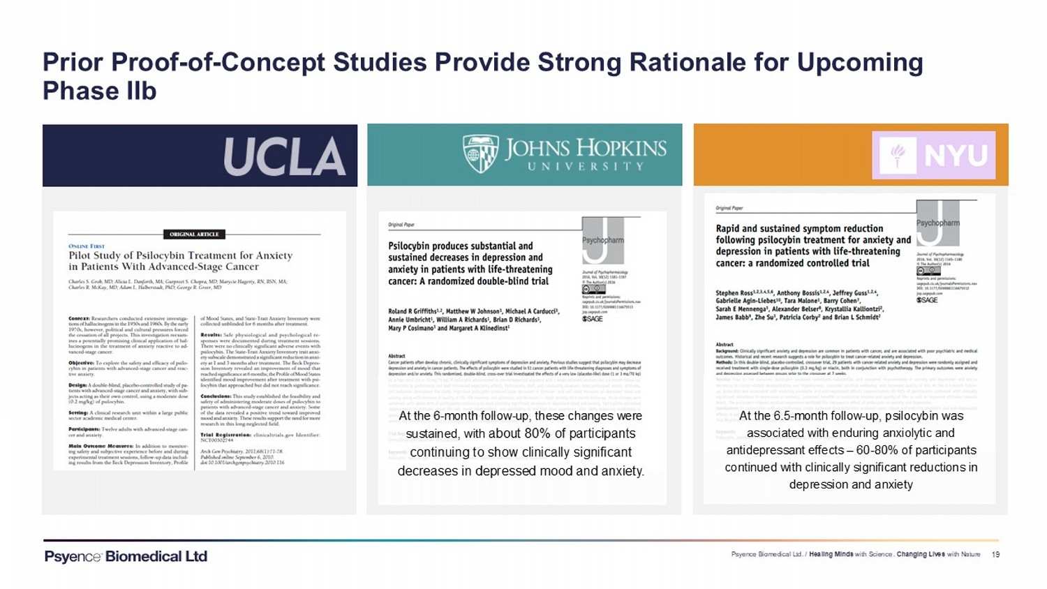 19 Psyence Biomedical Ltd. / Healing Minds with Science . Changing Lives with Nature Prior Proof - of - Concept Studies Provide Strong Rationale for Upcoming Phase IIb At the 6 - month follow - up, these changes were sustained, with about 80% of participants continuing to show clinically significant decreases in depressed mood and anxiety. At the 6.5 - month follow - up, psilocybin was associated with enduring anxiolytic and antidepressant effects – 60 - 80% of participants continued with clinically significant reductions in depression and anxiety