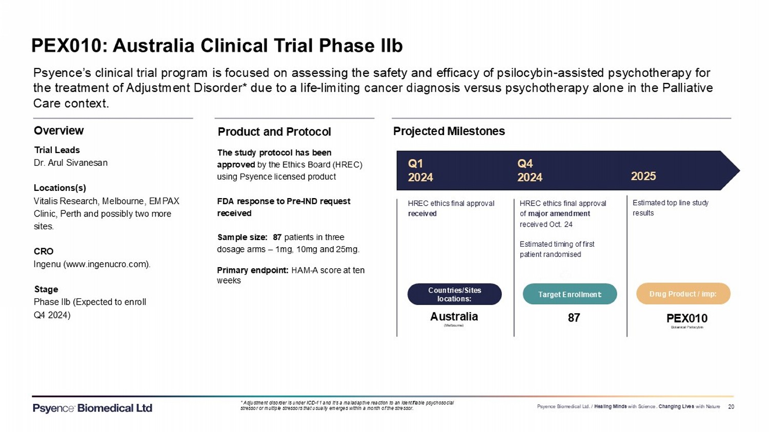 20 Psyence Biomedical Ltd. / Healing Minds with Science . Changing Lives with Nature Psyence’s clinical trial program is focused on assessing the safety and efficacy of psilocybin - assisted psychotherapy for the treatment of Adjustment Disorder* due to a life - limiting cancer diagnosis versus psychotherapy alone in the Palliative Care context. Trial Leads Dr. Arul Sivanesan Locations(s) Vitalis Research, Melbourne, EMPAX Clinic, Perth and possibly two more sites. CRO Ingenu (www.ingenucro.com). Stage Phase Ilb (Expected to enroll Q4 2024) The study protocol has been approved by the Ethics Board (HREC) using Psyence licensed product FDA response to Pre - IND request received Sample size: 87 patients in three dosage arms – 1mg, 10mg and 25mg. Primary endpoint: HAM - A score at ten weeks Q1 2024 Q4 2024 2025 Australia (Melbourne) 87 PEX010 Botanical Psilocybin * Adjustment disorder is under ICD - 11 and it’s a maladaptive reaction to an identifiable psychosocial stressor or multiple stressors that usually emerges within a month of the stressor. Estimated top line study results PEX010: Australia Clinical Trial Phase IIb Projected Milestones Product and Protocol Overview HREC ethics final approval received HR EC ethics final approval of major amendment received Oct. 24 Estimated timing of first patient randomised Countries/Sites locations: Target Enrollment : Drug Product / imp: