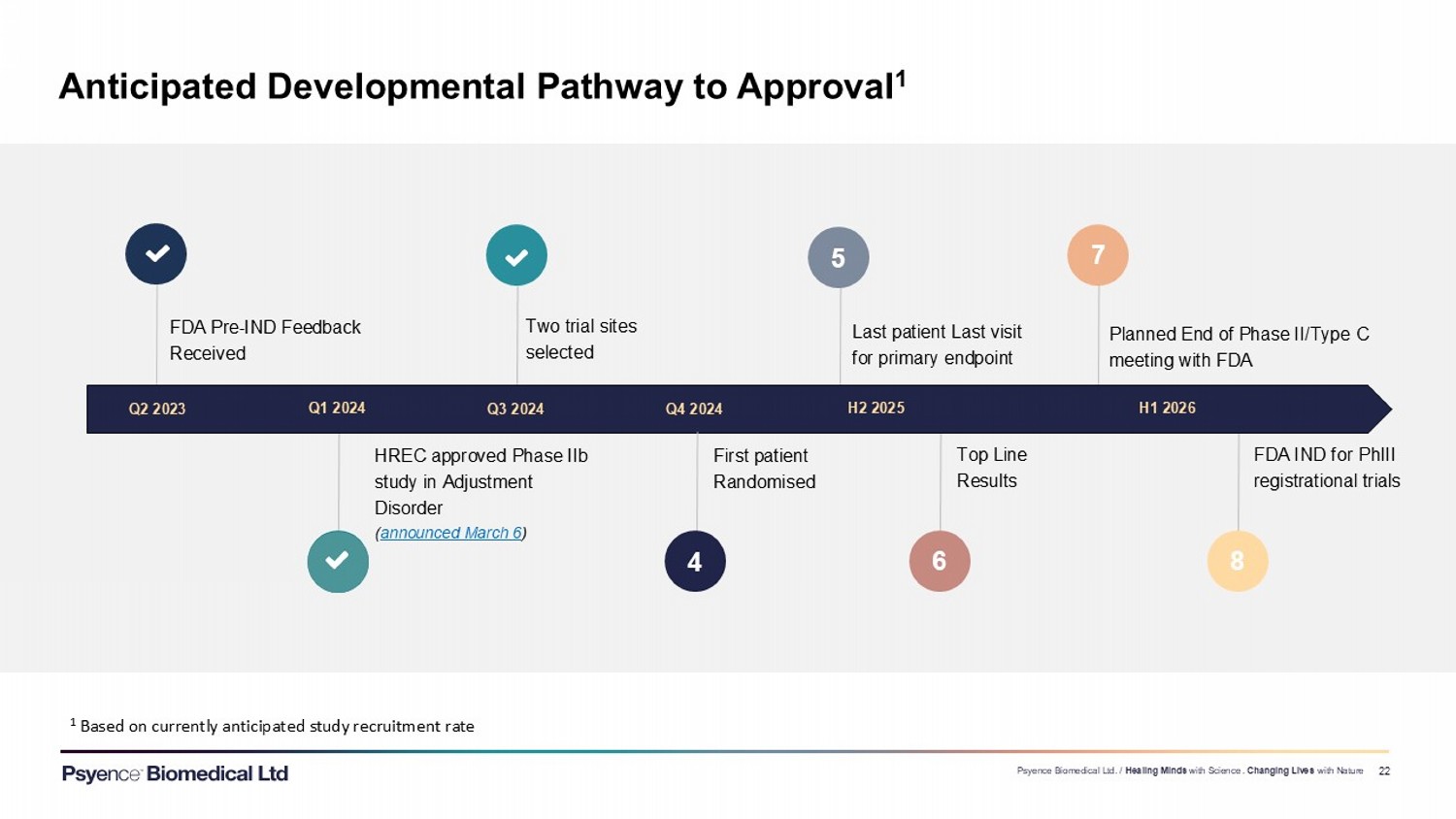 22 Psyence Biomedical Ltd. / Healing Minds with Science . Changing Lives with Nature FDA Pre - IND Feedback Received HREC approved Phase IIb study in Adjustment Disorder ( announced March 6 ) Two trial sites selected Last patient Last visit for primary endpoint Top Line Results Planned End of Phase II/Type C meeting with FDA FDA IND for PhIII registrational trials 6 8 2 5 7 Anticipated Developmental Pathway to Approval 1 Q2 2023 H2 2025 H1 2026 Q1 2024 Q3 2024 1 Based on currently anticipated study recruitment rate Q4 2024 First patient Randomised 4
