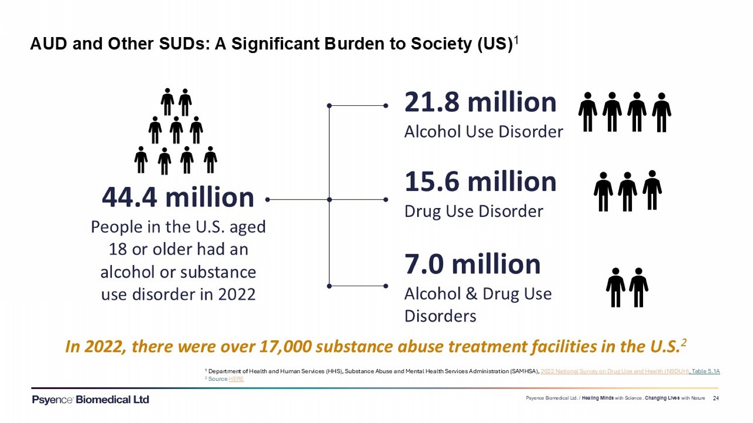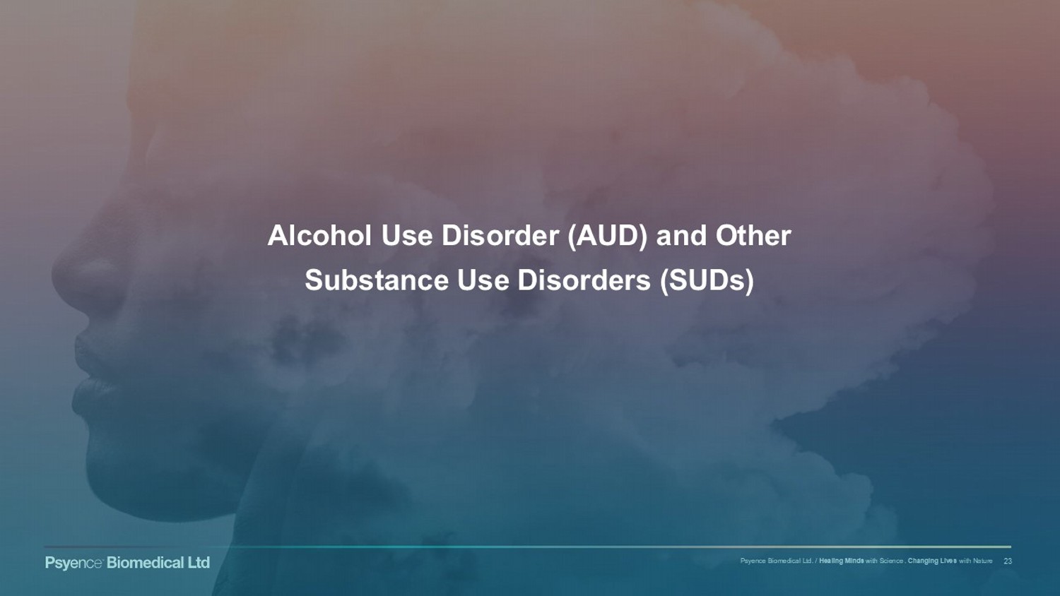 23 Psyence Biomedical Ltd. / Healing Minds with Science . Changing Lives with Nature Alcohol Use Disorder (AUD) and Other Substance Use Disorders (SUDs)