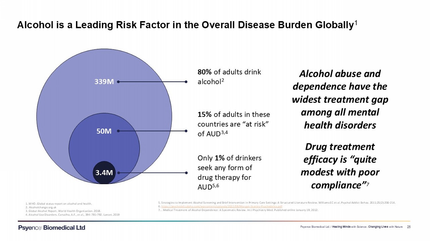 25 Psyence Biomedical Ltd. / Healing Minds with Science . Changing Lives with Nature Alcohol is a Leading Risk Factor in the Overall Disease Burden Globally 1 339M 50M 3.4M 80% of adults drink alcohol 2 15% of adults in these countries are “at risk” of AUD 3,4 Only 1% of drinkers seek any form of drug therapy for AUD 5,6 5. Strategies to Implement Alcohol Screening and Brief Intervention in Primary Care Settings: A Structured Literature Review. Wi lliams EC et al. Psychol Addict Behav . 2011;25(2):206 - 214. 6. https://psychedelicalpha.com/wp - content/uploads/2022/08/Morgan - Stanley - Psychedelics.pdf 7. . Medical Treatment of Alcohol Dependence: A Systematic Review. Int J Psychiatry Med. Published online January 19, 2012. 1. WHO. Global status report on alcohol and health. 2 . Alcoholchange.org.uk 3. Global Alcohol Report. World Health Organization. 2018. 4. Alcohol Use Disorders. Carvalho, A.F., et al., 394: 781 - 792. Lancet. 2019 Alcohol abuse and dependence have the widest treatment gap among all mental health disorders Drug treatment efficacy is “quite modest with poor compliance” 7