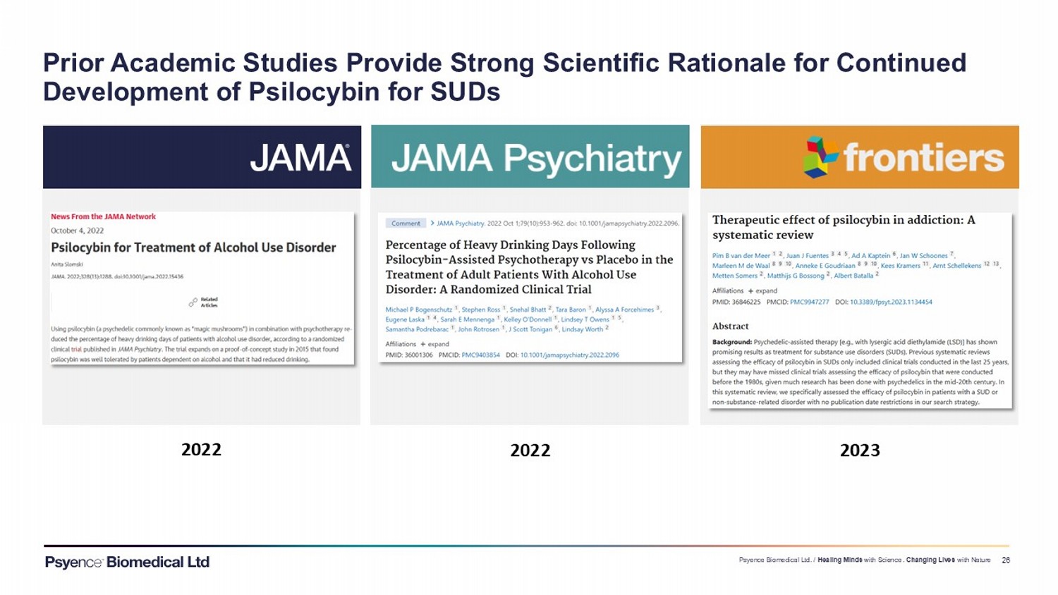 26 Psyence Biomedical Ltd. / Healing Minds with Science . Changing Lives with Nature Prior Academic Studies Provide Strong Scientific Rationale for Continued Development of Psilocybin for SUDs 2022 2022 2023