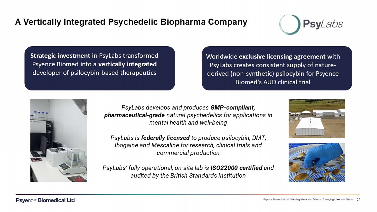 27 Psyence Biomedical Ltd. / Healing Minds with Science . Changing Lives with Nature A Vertically Integrated Psychedelic Biopharma Company Worldwide exclusive licensing agreement with PsyLabs creates consistent supply of nature - derived (non - synthetic) psilocybin for Psyence Biomed’s AUD clinical trial Strategic investment in PsyLabs transformed Psyence Biomed into a vertically integrated developer of psilocybin - based therapeutics PsyLabs develops and produces GMP - compliant, pharmaceutical - grade natural psychedelics for applications in mental health and well - being PsyLabs is federally licensed to produce psilocybin, DMT, Ibogaine and Mescaline for research, clinical trials and commercial production PsyLabs ’ fully operational, on - site lab is ISO22000 certified and audited by the British Standards Institution