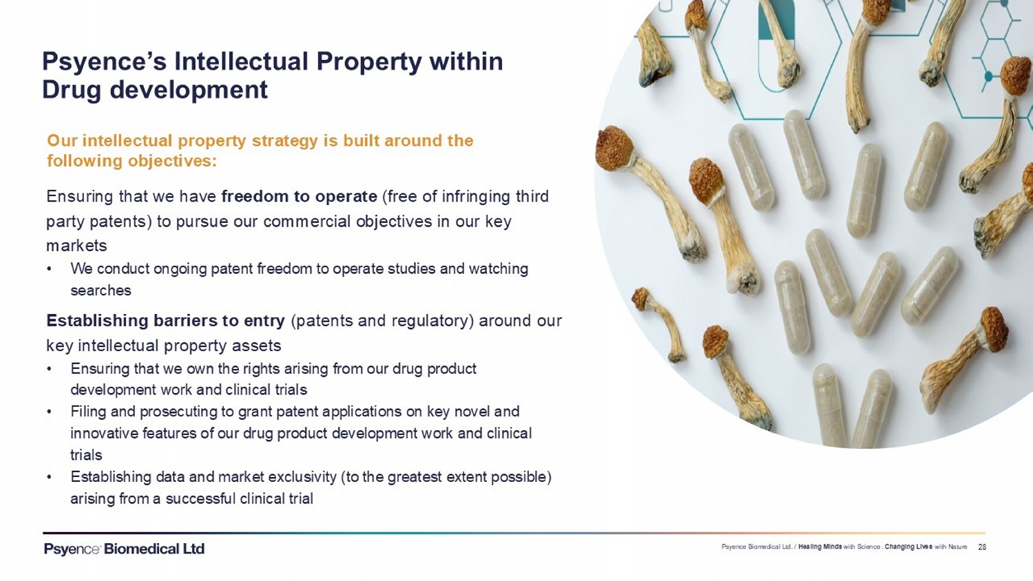 28 Psyence Biomedical Ltd. / Healing Minds with Science . Changing Lives with Nature Our intellectual property strategy is built around the following objectives: Ensuring that we have freedom to operate (free of infringing third party patents) to pursue our commercial objectives in our key markets • We conduct ongoing patent freedom to operate studies and watching searches Establishing barriers to entry (patents and regulatory) around our key intellectual property assets • Ensuring that we own the rights arising from our drug product development work and clinical trials • Filing and prosecuting to grant patent applications on key novel and innovative features of our drug product development work and clinical trials • Establishing data and market exclusivity (to the greatest extent possible) arising from a successful clinical trial Psyence’s Intellectual Property within Drug development