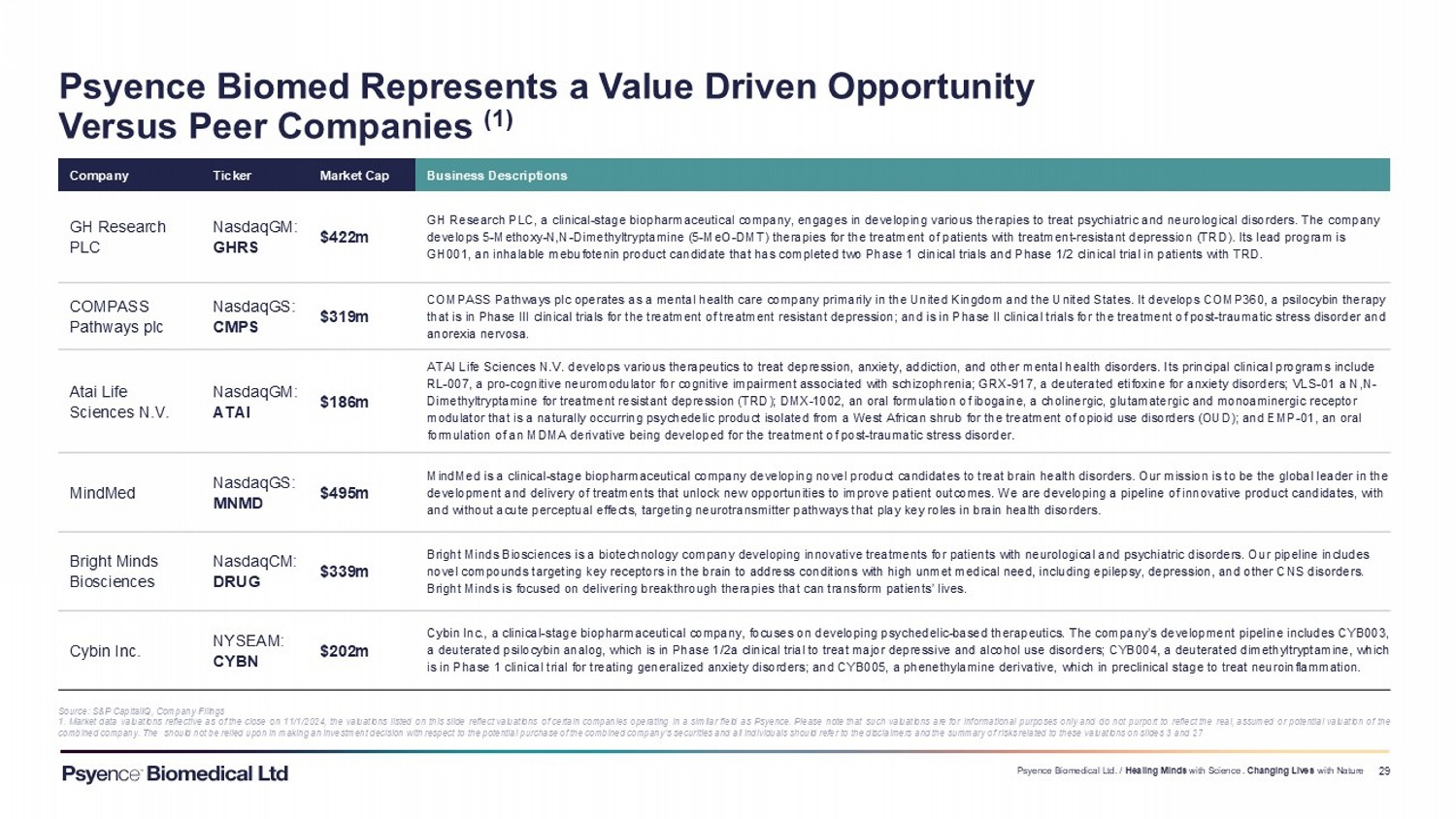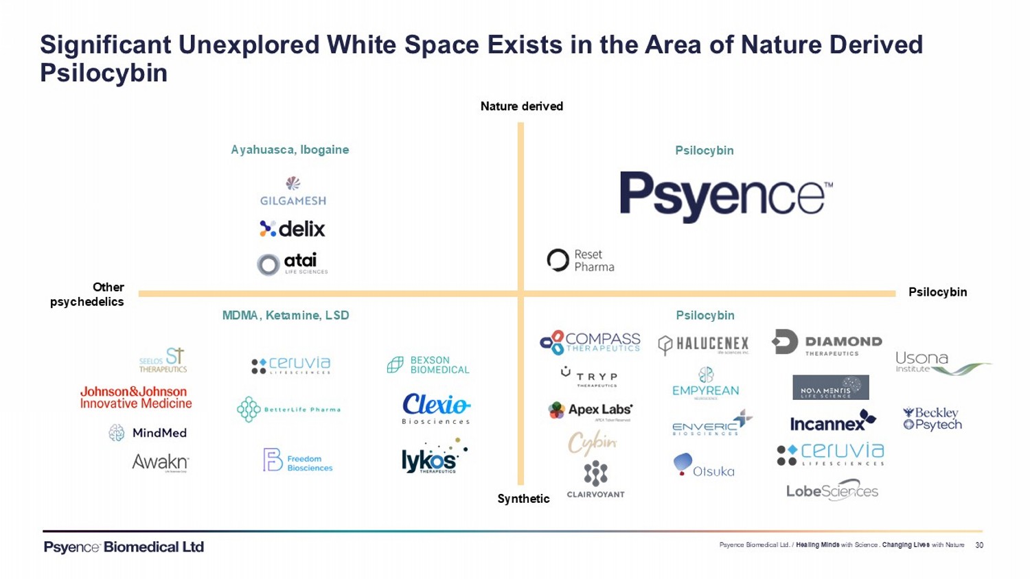 29 Psyence Biomedical Ltd. / Healing Minds with Science . Changing Lives with Nature Source : S&P CapitalIQ , Company Filings 1. Market data valuations reflective as of the close on 11 / 1 / 2024 , the valuations listed on this slide reflect valuations of certain companies operating in a similar field as Psyence . Please note that such valuations are for informational purposes only and do not purport to reflect the real, assumed or potential valuation of the combined company . The should not be relied upon in making an investment decision with respect to the potential purchase of the combined company’s securities and all individuals should refer to the disclaimers and the summary of risks related to these valuations on slides 3 and 27 Business Descriptions Market Cap Ticker Company GH Research PLC, a clinical - stage biopharmaceutical company, engages in developing various therapies to treat psychiatric and ne urological disorders. The company develops 5 - Methoxy - N,N - Dimethyltryptamine (5 - MeO - DMT) therapies for the treatment of patients with treatment - resistant depressio n (TRD). Its lead program is GH001, an inhalable mebufotenin product candidate that has completed two Phase 1 clinical trials and Phase 1/2 clinical trial in patients with TRD. $422m NasdaqGM : GHRS GH Research PLC COMPASS Pathways plc operates as a mental health care company primarily in the United Kingdom and the United States. It devel ops COMP360, a psilocybin therapy that is in Phase III clinical trials for the treatment of treatment resistant depression; and is in Phase II clinical trials for the treatment of post - traumatic stress disorder and anorexia nervosa. $319m NasdaqGS : CMPS COMPASS Pathways plc ATAI Life Sciences N.V. develops various therapeutics to treat depression, anxiety, addiction, and other mental health disord ers . Its principal clinical programs include RL - 007, a pro - cognitive neuromodulator for cognitive impairment associated with schizophrenia; GRX - 917, a deuterated etifoxine f or anxiety disorders; VLS - 01 a N,N - Dimethyltryptamine for treatment resistant depression (TRD); DMX - 1002, an oral formulation of ibogaine, a cholinergic, glutamate rgic and monoaminergic receptor modulator that is a naturally occurring psychedelic product isolated from a West African shrub for the treatment of opioid us e d isorders (OUD); and EMP - 01, an oral formulation of an MDMA derivative being developed for the treatment of post - traumatic stress disorder. $186m NasdaqGM : ATAI Atai Life Sciences N.V. MindMed is a clinical - stage biopharmaceutical company developing novel product candidates to treat brain health disorders. Our mission is to be the global leader in the development and delivery of treatments that unlock new opportunities to improve patient outcomes. We are developing a pipelin e o f innovative product candidates, with and without acute perceptual effects, targeting neurotransmitter pathways that play key roles in brain health disorders. $495m NasdaqGS : MNMD MindMed Bright Minds Biosciences is a biotechnology company developing innovative treatments for patients with neurological and psych iat ric disorders. Our pipeline includes novel compounds targeting key receptors in the brain to address conditions with high unmet medical need, including epilepsy, dep ression, and other CNS disorders. Bright Minds is focused on delivering breakthrough therapies that can transform patients’ lives. $339m NasdaqCM : DRUG Bright Minds Biosciences Cybin Inc., a clinical - stage biopharmaceutical company, focuses on developing psychedelic - based therapeutics. The company’s developme nt pipeline includes CYB003, a deuterated psilocybin analog , which is in Phase 1/2a clinical trial to treat major depressive and alcohol use disorders; CYB004, a deuterated dimethyltry pta mine, which is in Phase 1 clinical trial for treating generalized anxiety disorders; and CYB005, a phenethylamine derivative, which in pr ecl inical stage to treat neuroinflammation. $202m NYSEAM: CYBN Cybin Inc. Psyence Biomed Represents a Value Driven Opportunity Versus Peer Companies (1)