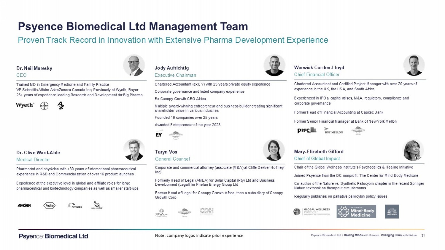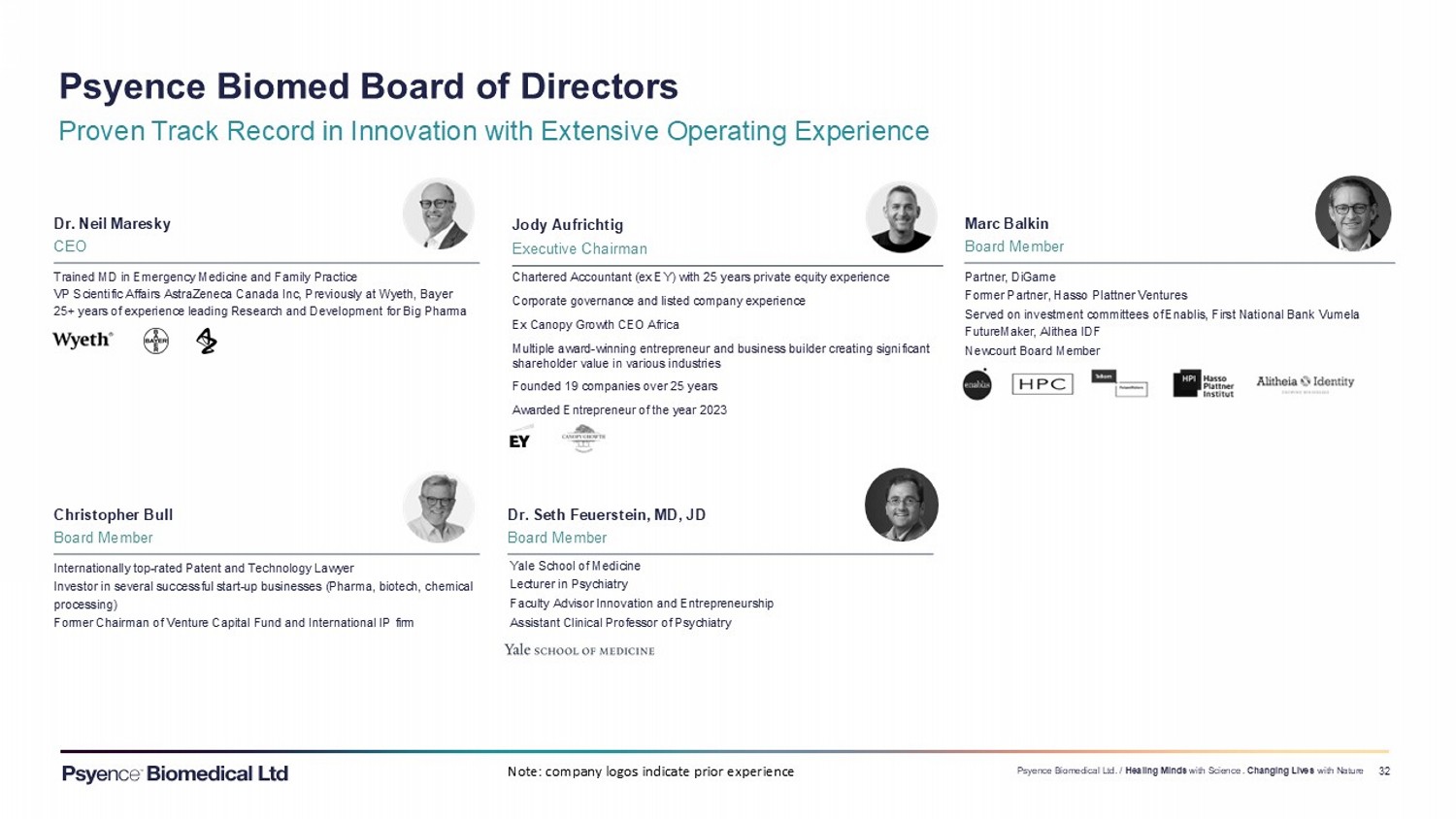 31 Psyence Biomedical Ltd. / Healing Minds with Science . Changing Lives with Nature Dr. Neil Maresky CEO Trained MD in Emergency Medicine and Family Practice VP Scientific Affairs AstraZeneca Canada Inc, Previously at Wyeth, Bayer 25+ years of experience leading Research and Development for Big Pharma Jody Aufrichtig Executive Chairman Chartered Accountant (ex EY) with 25 years private equity experience Corporate governance and listed company experience Ex Canopy Growth CEO Africa Multiple award - winning entrepreneur and business builder creating significant shareholder value in various industries Founded 19 companies over 25 years Awarded Entrepreneur of the year 2023 Warwick Corden - Lloyd Chief Financial Officer Chartered Accountant and Certified Project Manager with over 20 years of experience in the UK, the USA, and South Africa Experienced in IPOs, capital raises, M&A, regulatory, compliance and corporate governance Former Head of Financial Accounting at Capitec Bank Former Senior Financial Manager at Bank of New York Mellon Taryn Vos General Counsel Corporate and commercial attorney (associate (M&A) at Cliffe Dekker Hofmeyr Inc). Formerly Head of Legal (AMEA) for Solar Capital (Pty) Ltd and Business Development (Legal) for Phelan Energy Group Ltd Former Head of Legal for Canopy Growth Africa, then a subsidiary of Canopy Growth Corp Dr. Clive Ward - Able Medical Director Pharmacist and physician with >30 years of international pharmaceutical experience in R&D and Commercialization of over 16 product launches Experience at the executive level in global and affiliate roles for large pharmaceutical and biotechnology companies as well as smaller start - ups Proven Track Record in Innovation with Extensive Pharma Development Experience Psyence Biomedical Ltd Management Team Mary - Elizabeth Gifford Chief of Global Impact Chair of the Global Wellness Institute’s Psychedelics & Healing Initiative Joined Psyence from the DC nonprofit, The Center for Mind - Body Medicine Co - author of the Nature vs. Synthetic Psilocybin chapter in the recent Springer Nature textbook on therapeutic mushrooms Regularly publishes on palliative psilocybin policy issues Note: company logos indicate prior experience