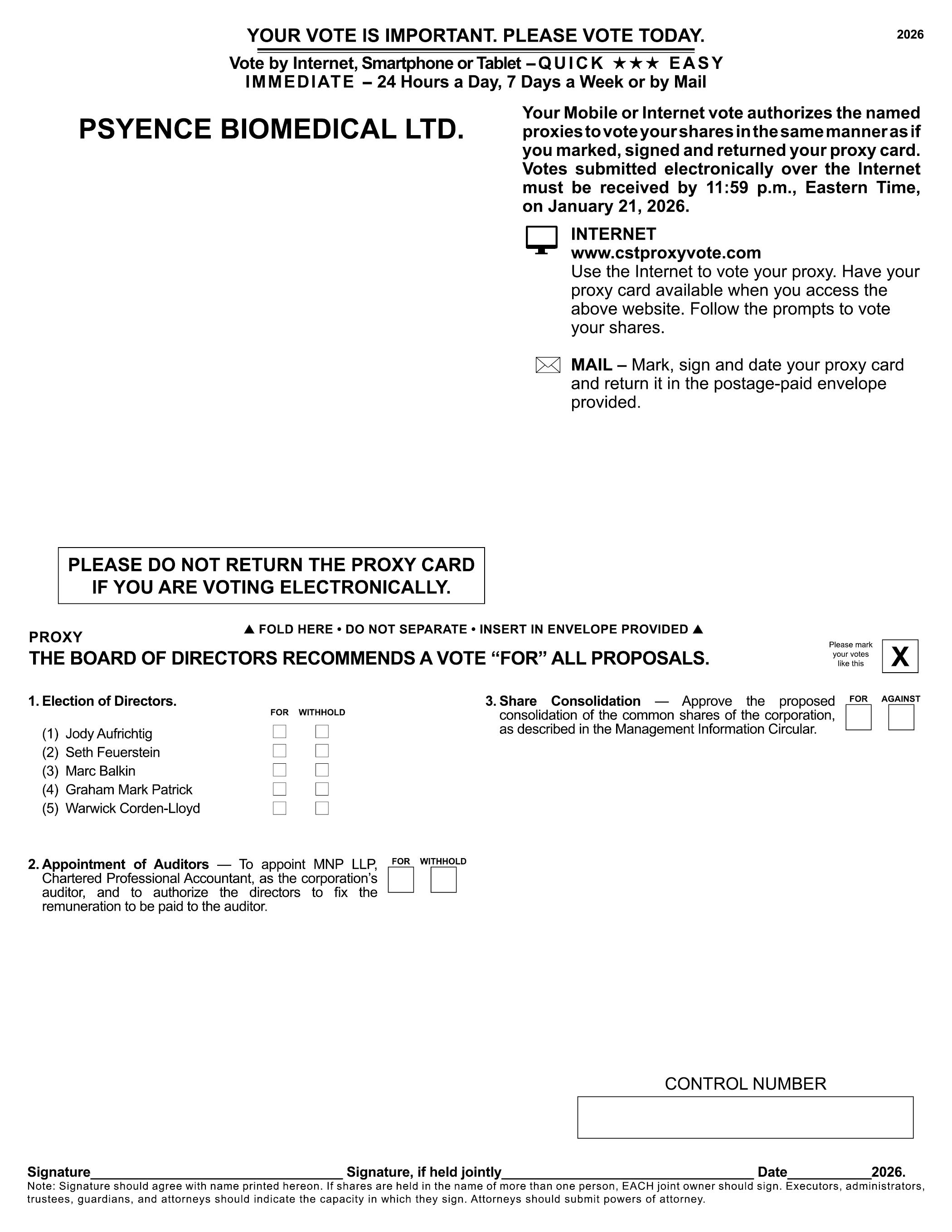 YOUR VOTE IS IMPORTANT. PLEASE VOTE TODAY. 2026 Vote by Internet, Smartphone or Tablet – QUICK EASY IMMEDIATE - 24 Hours a Day, 7 Days a Week or by Mail PSYENCE BIOMEDICAL LTD. Your Mobile or Internet vote authorizes the named proxies to vote your shares in the same manner as if you marked, signed and returned your proxy card. Votes submitted electronically over the Internet must be received by 11:59 p.m., Eastern Time, on January 21, 2026. INTERNET www.cstproxyvote.com Use the Internet to vote your proxy. Have your proxy card available when you access the above website. Follow the prompts to vote your shares. MAIL – Mark, sign and date your proxy card and return it in the postage-paid envelope provided. PLEASE DO NOT RETURN THE PROXY CARD IF YOU ARE VOTING ELECTRONICALLY. PROXY FOLD HERE • DO NOT SEPARATE • INSERT IN ENVELOPE PROVIDED THE BOARD OF DIRECTORS RECOMMENDS A VOTE “FOR” ALL PROPOSALS. Please mark your votes like this 1. Election of Directors. FOR WITHHOLD (1) Jody Aufrichtig (2) Seth Feuerstein (3) Marc Balkin (4) Graham Mark Patrick (5) Warwick Corden-Lloyd 2. Appointment of Auditors — To appoint MNP LLP, Chartered Professional Accountant, as the corporation’s auditor, and to authorize the directors to fix the remuneration to be paid to the auditor. FOR WITHHOLD 3. Share Consolidation — Approve the proposed consolidation of the common shares of the corporation, as described in the Management Information Circular. FOR AGAINST CONTROL NUMBER Signature Signature, if held jointly Date 2026. Note: Signature should agree with name printed hereon. If shares are held in the name of more than one person, EACH joint owner should sign. Executors, administrators, trustees, guardians, and attorneys should indicate the capacity in which they sign. Attorneys should submit powers of attorney.