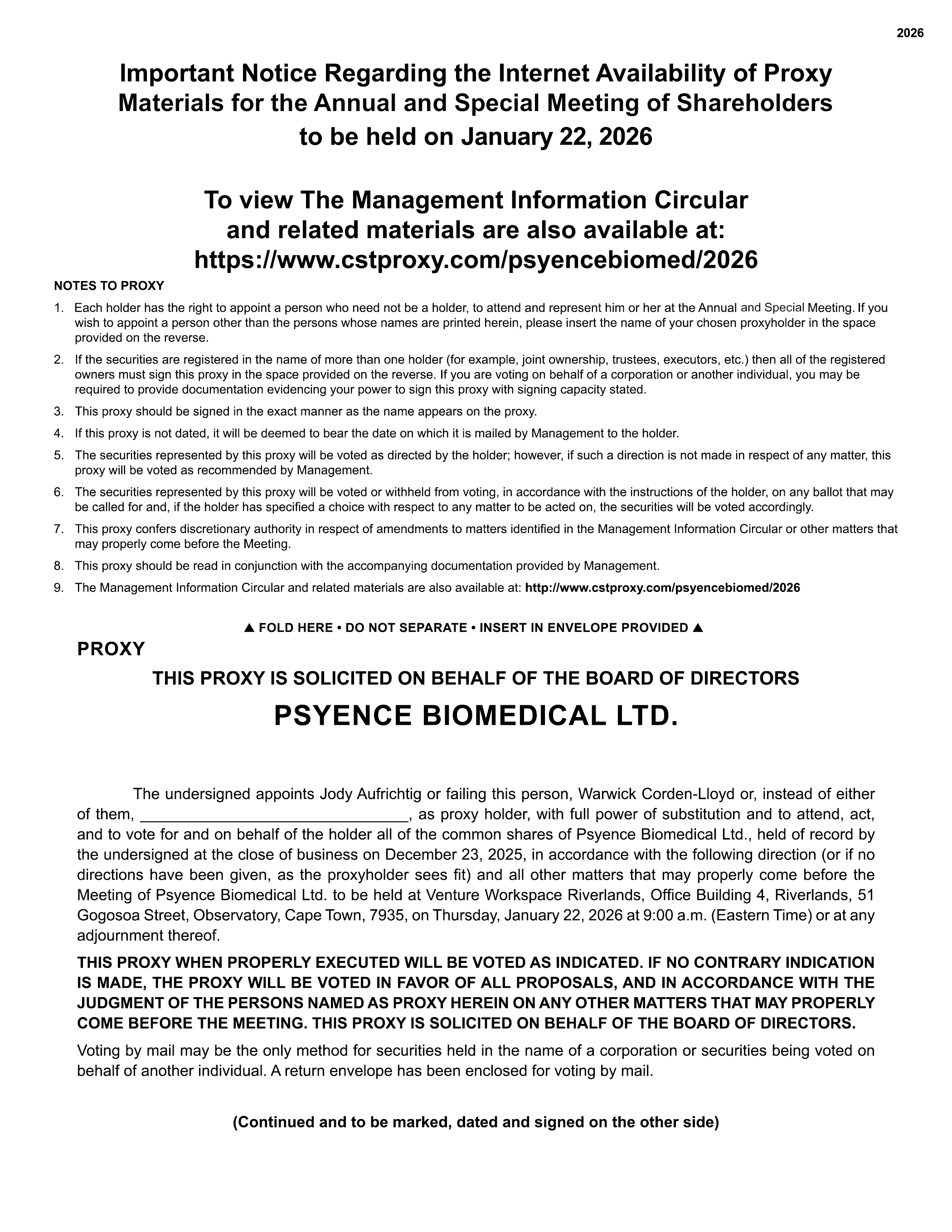 2026 Important Notice Regarding the Internet Availability of Proxy Materials for the Annual and Special Meeting of Shareholders to be held on January 22, 2026 To view The Management Information Circular and related materials are also available at: https://www.cstproxy.com/psyencebiomed/2026 NOTES TO PROXY 1. Each holder has the right to appoint a person who need not be a holder, to attend and represent him or her at the Annual and Special Meeting of Shareholders. If you wish to appoint a person other than the persons whose names are printed herein, please insert the name of your chosen proxyholder in the space provided on the reverse. 2. If the securities are registered in the name of more than one holder (for example, joint ownership, trustees, executors, etc.) then all of the registered owners must sign this proxy in the space provided on the reverse. If you are voting on behalf of a corporation or another individual, you may be required to provide documentation evidencing your power to sign this proxy with signing capacity stated. 3. This proxy should be signed in the exact manner as the name appears on the proxy. 4. If this proxy is not dated, it will be deemed to bear the date on which it is mailed by Management to the holder. 5. The securities represented by this proxy will be voted as directed by the holder; however, if such a direction is not made in respect of any matter, this proxy will be voted as recommended by Management. 6. The securities represented by this proxy will be voted or withheld from voting, in accordance with the instructions of the holder, on any ballot that may be called for and, if the holder has specified a choice with respect to any matter to be acted on, the securities will be voted accordingly. 7. This proxy confers discretionary authority in respect of amendments to matters identified in the Management Information Circular or other matters that may properly come before the Meeting. 8. This proxy should be read in conjunction with the accompanying documentation provided by Management. 9. The Management Information Circular and related materials are also available at: http://www.cstproxy.com/psyencebiomed/2026 FOLD HERE • DO NOT SEPARATE • INSERT IN ENVELOPE PROVIDED PROXY THIS PROXY IS SOLICITED ON BEHALF OF THE BOARD OF DIRECTORS PSYENCE BIOMEDICAL LTD. The undersigned appoints Jody Aufrichtig or failing this person, Warwick Corden-Lloyd or, instead of either of them, , as proxy holder, with full power of substitution and to attend, act, and to vote for and on behalf of the holder all of the common shares of Psyence Biomedical Ltd., held of record by the undersigned at the close of business on December 23, 2025, in accordance with the following direction (or if no directions have been given, as the proxyholder sees fit) and all other matters that may properly come before the Meeting of Psyence Biomedical Ltd. to be held at Venture Workspace Riverlands, Office Building 4, Riverlands, 51 Gogosoa Street, Observatory, Cape Town, 7935, on Thursday, January 22, 2026 at 9:00 a.m. (Eastern Time) or at any adjournment thereof. THIS PROXY WHEN PROPERLY EXECUTED WILL BE VOTED AS INDICATED. IF NO CONTRARY INDICATION IS MADE, THE PROXY WILL BE VOTED IN FAVOR OF ALL PROPOSALS, AND IN ACCORDANCE WITH THE JUDGMENT OF THE PERSONS NAMED AS PROXY HEREIN ON ANY OTHER MATTERS THAT MAY PROPERLY COME BEFORE THE MEETING. THIS PROXY IS SOLICITED ON BEHALF OF THE BOARD OF DIRECTORS. Voting by mail may be the only method for securities held in the name of a corporation or securities being voted on behalf of another individual. A return envelope has been enclosed for voting by mail. (Continued and to be marked, dated and signed on the other side)