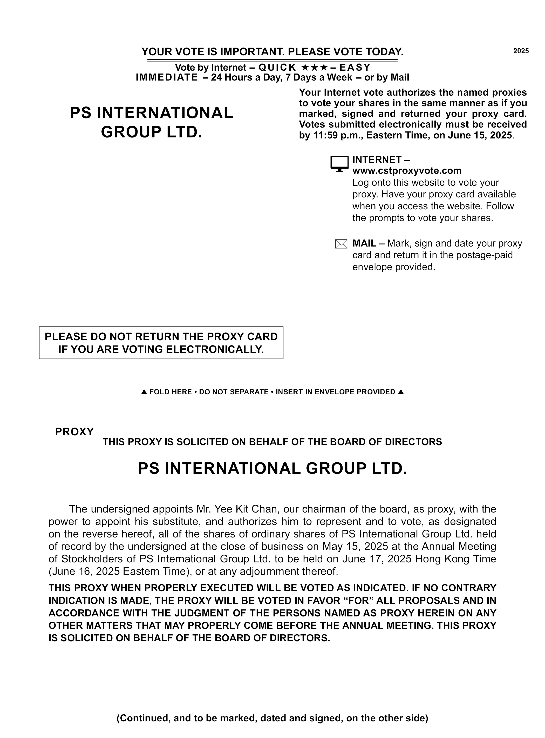 YOUR VOTE IS IMPORTANT. PLEASE VOTE TODAY. 2025 Vote by Internet - QUICK – EASY IMMEDIATE - 24 Hours a Day, 7 Days a Week - or by Mail Your Internet vote authorizes the named proxies to vote your shares in the same manner as if you marked, signed and returned your proxy card. Votes submitted electronically must be received by 11:59 p.m., Eastern Time, on June 15, 2025. PS INTERNATIONAL GROUP LTD. INTERNET – www.cstproxyvote.com Log onto this website to vote your proxy. Have your proxy card available when you access the website. Follow the prompts to vote your shares. MAIL – Mark, sign and date your proxy card and return it in the postage-paid envelope provided. PLEASE DO NOT RETURN THE PROXY CARD IF YOU ARE VOTING ELECTRONICALLY. FOLD HERE • DO NOT SEPARATE • INSERT IN ENVELOPE PROVIDED PROXY THIS PROXY IS SOLICITED ON BEHALF OF THE BOARD OF DIRECTORS The undersigned appoints Mr. Yee Kit Chan, our chairman of the board, as proxy, with the power to appoint his substitute, and authorizes him to represent and to vote, as designated on the reverse hereof, all of the shares of ordinary shares of PS International Group Ltd. held of record by the undersigned at the close of business on May 15, 2025 at the Annual Meeting of Stockholders of PS International Group Ltd. to be held on June 17, 2025 Hong Kong Time (June 16, 2025 Eastern Time), or at any adjournment thereof. THIS PROXY WHEN PROPERLY EXECUTED WILL BE VOTED AS INDICATED. IF NO CONTRARY INDICATION IS MADE, THE PROXY WILL BE VOTED IN FAVOR “FOR” ALL PROPOSALS AND IN ACCORDANCE WITH THE JUDGMENT OF THE PERSONS NAMED AS PROXY HEREIN ON ANY OTHER MATTERS THAT MAY PROPERLY COME BEFORE THE ANNUAL MEETING. THIS PROXY IS SOLICITED ON BEHALF OF THE BOARD OF DIRECTORS. (Continued, and to be marked, dated and signed, on the other side)