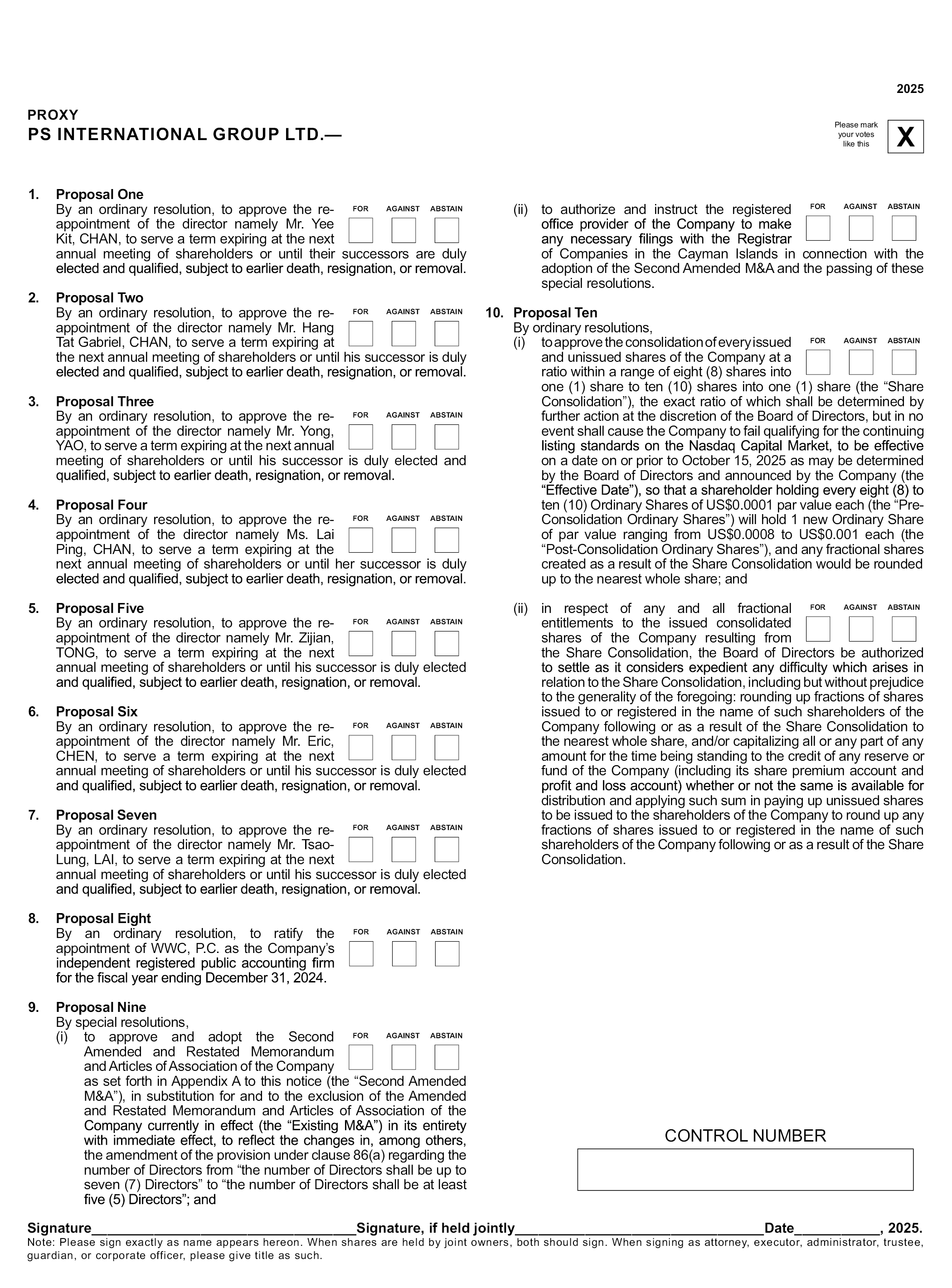 PROXY PS INTERNATIONAL GROUP LTD.— 2025 1. Proposal One By an ordinary resolution, to approve the re-appointment of the director namely Mr. Yee Kit, CHAN, to serve a term expiring at the next annual meeting of shareholders or until their successors are duly elected and qualified, subject to earlier death, resignation, or removal. FOR AGAINST ABSTAIN 2. Proposal Two By an ordinary resolution, to approve the re-appointment of the director namely Mr. Hang Tat Gabriel, CHAN, to serve a term expiring at the next annual meeting of shareholders or until his successor is duly elected and qualified, subject to earlier death, resignation, or removal. FOR AGAINST ABSTAIN 3. Proposal Three By an ordinary resolution, to approve the re-appointment of the director namely Mr. Yong, YAO, to serve a term expiring at the next annual meeting of shareholders or until his successor is duly elected and qualified, subject to earlier death, resignation, or removal. . FOR AGAINST ABSTAIN 4. Proposal Four By an ordinary resolution, to approve the re-appointment of the director namely Ms. Lai Ping, CHAN, to serve a term expiring at the next annual meeting of shareholders or until her successor is duly elected and qualified, subject to earlier death, resignation, or removal. FOR AGAINST ABSTAIN 5. Proposal Five By an ordinary resolution, to approve the re-appointment of the director namely Mr. Zijian, TONG, to serve a term expiring at the next annual meeting of shareholders or until his successor is duly elected and qualified, subject to earlier death, resignation, or removal. FOR AGAINST ABSTAIN 6. Proposal Six By an ordinary resolution, to approve the re-appointment of the director namely Mr. Eric, CHEN, to serve a term expiring at the next annual meeting of shareholders or until his successor is duly elected and qualified, subject to earlier death, resignation, or removal. FOR AGAINST ABSTAIN 7. Proposal Seven By an ordinary resolution, to approve the re-appointment of the director namely Mr. Tsao- Lung, LAI, to serve a term expiring at the next annual meeting of shareholders or until his successor is duly elected and qualified, subject to earlier death, resignation, or removal. FOR AGAINST ABSTAIN 8. Proposal Eight By an ordinary resolution, to ratify the appointment of WWC, P.C. as the Company’s independent registered public accounting firm for the fiscal year ending December 31, 2024. 9. Proposal Nine By special resolutions, (i) to approve and adopt the Second Amended and Restated Memorandum and Articles of Association of the Company as set forth in Appendix A to this notice (the “Second Amended M&A”), in substitution for and to the exclusion of the Amended and Restated Memorandum and Articles of Association of the Company currently in effect (the “Existing M&A”) in its entirety with immediate effect, to reflect the changes in, among others, the amendment of the provision under clause 86(a) regarding the number of Directors from “the number of Directors shall be up to seven (7) Directors” to “the number of Directors shall be at least five (5) Directors”; and FOR AGAINST ABSTAIN (ii) to authorize and instruct the registered office provider of the Company to make any necessary filings with the Registrar of Companies in the Cayman Islands in connection with the adoption of the Second Amended M&A and the passing of these special resolutions. FOR AGAINST ABSTAIN 10. Proposal Ten By ordinary resolutions, (i) to approve the consolidation of every issued and unissued shares of the Company at a ratio within a range of eight (8) shares into one (1) share to ten (10) shares into one (1) share (the “Share Consolidation”), the exact ratio of which shall be determined by further action at the discretion of the Board of Directors, but in no event shall cause the Company to fail qualifying for the continuing listing standards on the Nasdaq Capital Market, to be effective on a date on or prior to October 15, 2025 as may be determined by the Board of Directors and announced by the Company (the “Effective Date”), so that a shareholder holding every eight (8) to ten (10) Ordinary Shares of US$0.0001 par value each (the “Pre- Consolidation Ordinary Shares”) will hold 1 new Ordinary Share of par value ranging from US$0.0008 to US$0.001 each (the “Post-Consolidation Ordinary Shares”), and any fractional shares created as a result of the Share Consolidation would be rounded up to the nearest whole share; and FOR AGAINST ABSTAIN (ii) in respect of any and all fractional entitlements to the issued consolidated shares of the Company resulting from the Share Consolidation, the Board of Directors be authorized to settle as it considers expedient any difficulty which arises in relation to the Share Consolidation, including but without prejudice to the generality of the foregoing: rounding up fractions of shares issued to or registered in the name of such shareholders of the Company following or as a result of the Share Consolidation to the nearest whole share, and/or capitalizing all or any part of any amount for the time being standing to the credit of any reserve or fund of the Company (including its share premium account and profit and loss account) whether or not the same is available for distribution and applying such sum in paying up unissued shares to be issued to the shareholders of the Company to round up any fractions of shares issued to or registered in the name of such shareholders of the Company following or as a result of the Share Consolidation. Please mark your votes like this CONTROL NUMBER Signature Signature, if held jointly Date , 2025. Note: Please sign exactly as name appears hereon. When shares are held by joint owners, both should sign. When signing as attorney, executor, administrator, trustee, guardian, or corporate officer, please give title as such.
