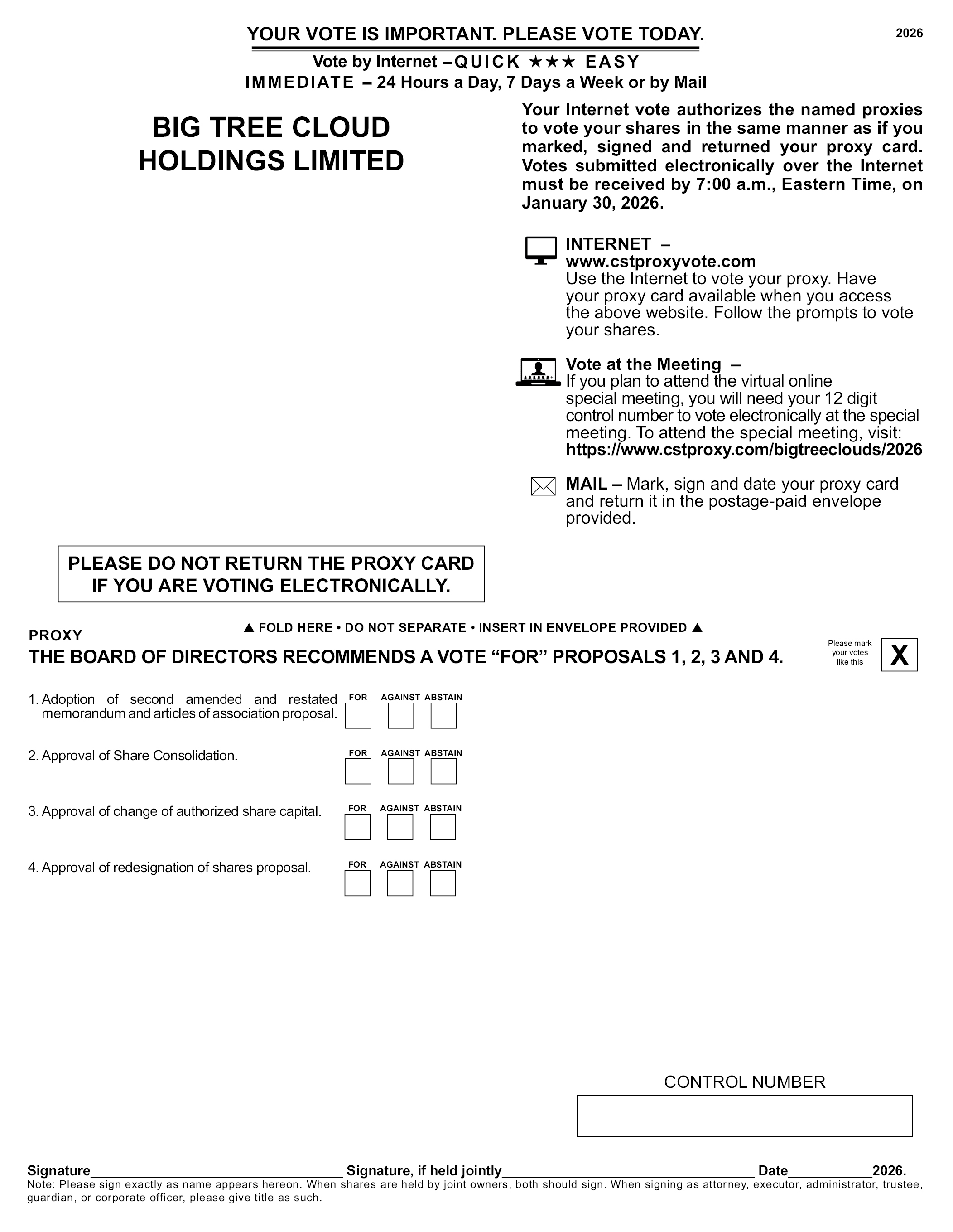 YOUR VOTE IS IMPORTANT. PLEASE VOTE TODAY. IMMEDIATE - 24 Hours a Day, 7 Days a Week or by Mail Vote by Internet - QUICK EASY 2026 BIG TREE CLOUD HOLDINGS LIMITED Your Internet vote authorizes the named proxies to vote your shares in the same manner as if you marked, signed and returned your proxy card. Votes submitted electronically over the Internet must be received by 7:00 a.m., Eastern Time, on January 30, 2026. INTERNET – www.cstproxyvote.com Use the Internet to vote your proxy. Have your proxy card available when you access the above website. Follow the prompts to vote your shares. Vote at the Meeting – If you plan to attend the virtual online special meeting, you will need your 12 digit control number to vote electronically at the special meeting. To attend the special meeting, visit: https://www.cstproxy.com/bigtreeclouds/2026 MAIL – Mark, sign and date your proxy card and return it in the postage-paid envelope provided. PLEASE DO NOT RETURN THE PROXY CARD IF YOU ARE VOTING ELECTRONICALLY. FOLD HERE • DO NOT SEPARATE • INSERT IN ENVELOPE PROVIDED PROXY THE BOARD OF DIRECTORS RECOMMENDS A VOTE “FOR” PROPOSALS 1, 2, 3 AND 4. Please mark your votes like this 1. Adoption of second amended and restated memorandum and articles of association proposal. FOR AGAINST ABSTAIN 2. Approval of Share Consolidation. 3. Approval of change of authorized share capital. 4. Approval of redesignation of shares proposal. CONTROL NUMBER Signature Signature, if held jointly Date 2026. Note: Please sign exactly as name appears hereon. When shares are held by joint owners, both should sign. When signing as attorney, executor, administrator, trustee, guardian, or corporate officer, please give title as such.