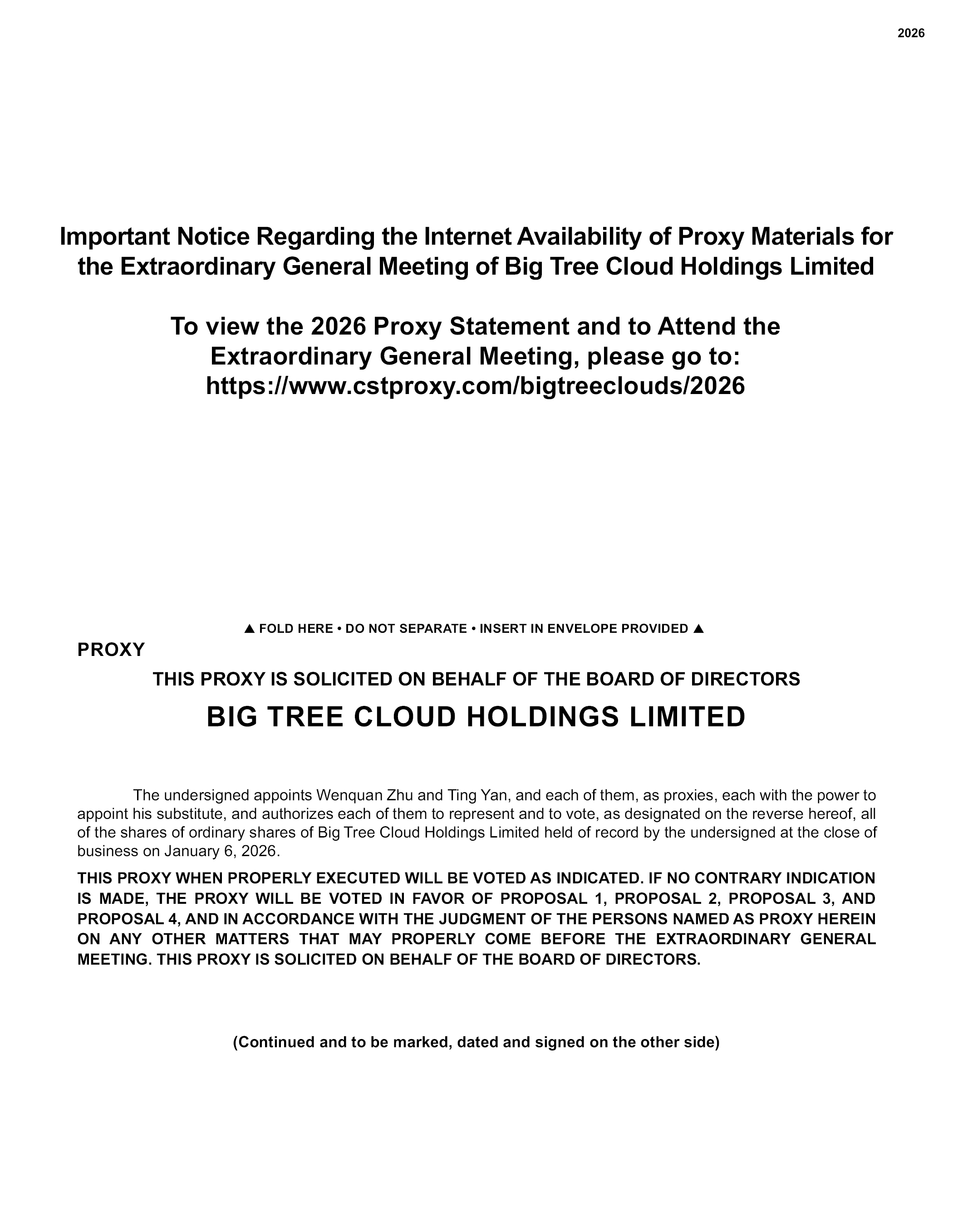 2026 Important Notice Regarding the Internet Availability of Proxy Materials for the Extraordinary General Meeting of Big Tree Cloud Holdings Limited To view the 2026 Proxy Statement and to Attend the Extraordinary General Meeting, please go to: https://www.cstproxy.com/bigtreeclouds/2026 FOLD HERE DO NOT SEPARATE INSERT IN ENVELOPE PROVIDED PROXY THIS PROXY IS SOLICITED ON BEHALF OF THE BOARD OF DIRECTORS BIG TREE CLOUD HOLDINGS LIMITED The undersigned appoints Wenquan Zhu and Ting Yan, and each of them, as proxies, each with the power to appoint his substitute, and authorizes each of them to represent and to vote, as designated on the reverse hereof, all of the shares of ordinary shares of Big Tree Cloud Holdings Limited held of record by the undersigned at the close of business on January 6, 2026. THIS PROXY WHEN PROPERLY EXECUTED WILL BE VOTED AS INDICATED. IF NO CONTRARY INDICATION IS MADE, THE PROXY WILL BE VOTED IN FAVOR OF PROPOSAL 1, PROPOSAL 2, PROPOSAL 3, AND PROPOSAL 4, AND IN ACCORDANCE WITH THE JUDGMENT OF THE PERSONS NAMED AS PROXY HEREIN ON ANY OTHER MATTERS THAT MAY PROPERLY COME BEFORE THE EXTRAORDINARY GENERAL MEETING. THIS PROXY IS SOLICITED ON BEHALF OF THE BOARD OF DIRECTORS. (Continued and to be marked, dated and signed on the other side)