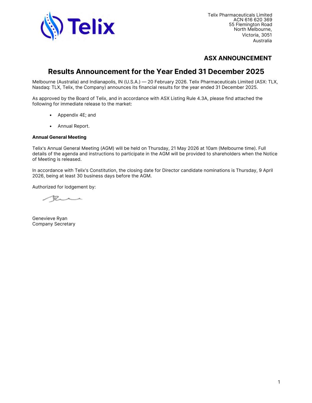 Telix Pharmaceuticals Limited ACN 616 620 369 55 Flemington Road North Melbourne, Victoria, 3051 Australia ASX ANNOUNCEMENT Results Announcement for the Year Ended 31 December 2025 Melbourne (Australia) and Indianapolis, IN (U.S.A.) — 20 February 2026. Telix Pharmaceuticals Limited (ASX: TLX, Nasdaq: TLX, Telix, the Company) announces its financial results for the year ended 31 December 2025. As approved by the Board of Telix, and in accordance with ASX Listing Rule 4.3A, please find attached the following for immediate release to the market: • Appendix 4E; and • Annual Report. Annual General Meeting Telix's Annual General Meeting (AGM) will be held on Thursday, 21 May 2026 at 10am (Melbourne time). Full details of the agenda and instructions to participate in the AGM will be provided to shareholders when the Notice of Meeting is released. In accordance with Telix's Constitution, the closing date for Director candidate nominations is Thursday, 9 April 2026, being at least 30 business days before the AGM. Authorized for lodgement by: Genevieve Ryan Company Secretary 1