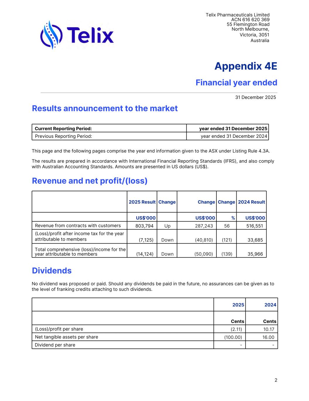 Telix Pharmaceuticals Limited ACN 616 620 369 55 Flemington Road North Melbourne, Victoria, 3051 Australia Appendix 4E Financial year ended 31 December 2025 Results announcement to the market Current Reporting Period: year ended 31 December 2025 Previous Reporting Period: year ended 31 December 2024 This page and the following pages comprise the year end information given to the ASX under Listing Rule 4.3A. The results are prepared in accordance with International Financial Reporting Standards (IFRS), and also comply with Australian Accounting Standards. Amounts are presented in US dollars (US$). Revenue and net profit/(loss) 2025 Result Change Change Change 2024 Result US$'000 US$'000 % US$'000 Revenue from contracts with customers 803,794 Up 287,243 56 516,551 (Loss)/profit after income tax for the year attributable to members (7,125) Down (40,810) (121) 33,685 Total comprehensive (loss)/income for the year attributable to members (14,124) Down (50,090) (139) 35,966 Dividends No dividend was proposed or paid. Should any dividends be paid in the future, no assurances can be given as to the level of franking credits attaching to such dividends. 2025 2024 Cents Cents (Loss)/profit per share (2.11) 10.17 Net tangible assets per share (100.00) 16.00 Dividend per share - - 2