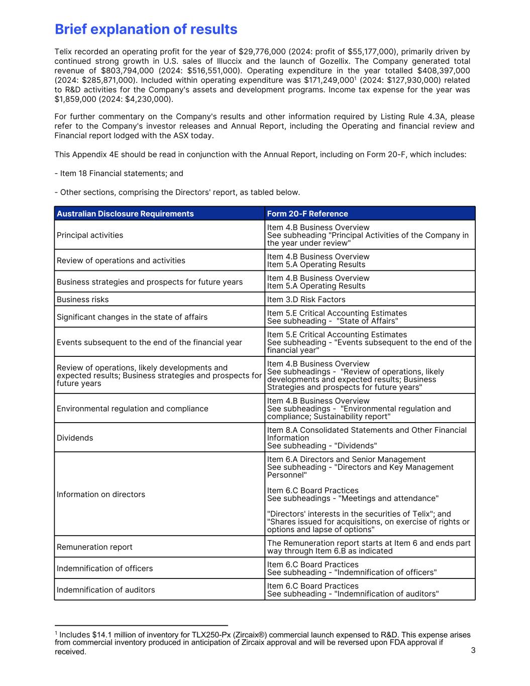 Brief explanation of results Telix recorded an operating profit for the year of $29,776,000 (2024: profit of $55,177,000), primarily driven by continued strong growth in U.S. sales of Illuccix and the launch of Gozellix. The Company generated total revenue of $803,794,000 (2024: $516,551,000). Operating expenditure in the year totalled $408,397,000 (2024: $285,871,000). Included within operating expenditure was $171,249,0001 (2024: $127,930,000) related to R&D activities for the Company's assets and development programs. Income tax expense for the year was $1,859,000 (2024: $4,230,000). For further commentary on the Company's results and other information required by Listing Rule 4.3A, please refer to the Company's investor releases and Annual Report, including the Operating and financial review and Financial report lodged with the ASX today. This Appendix 4E should be read in conjunction with the Annual Report, including on Form 20-F, which includes: - Item 18 Financial statements; and - Other sections, comprising the Directors' report, as tabled below. Principal activities Item 4.B Business Overview See subheading "Principal Activities of the Company in the year under review" Review of operations and activities Item 4.B Business Overview Item 5.A Operating Results Business strategies and prospects for future years Item 4.B Business Overview Item 5.A Operating Results Business risks Item 3.D Risk Factors Significant changes in the state of affairs Item 5.E Critical Accounting Estimates See subheading - "State of Affairs" Events subsequent to the end of the financial year Item 5.E Critical Accounting Estimates See subheading - "Events subsequent to the end of the financial year" Review of operations, likely developments and expected results; Business strategies and prospects for future years Item 4.B Business Overview See subheadings - "Review of operations, likely developments and expected results; Business Strategies and prospects for future years" Environmental regulation and compliance Item 4.B Business Overview See subheadings - "Environmental regulation and compliance; Sustainability report" Dividends Item 8.A Consolidated Statements and Other Financial Information See subheading - "Dividends" Information on directors Item 6.A Directors and Senior Management See subheading - "Directors and Key Management Personnel" Item 6.C Board Practices See subheadings - "Meetings and attendance" "Directors' interests in the securities of Telix"; and "Shares issued for acquisitions, on exercise of rights or options and lapse of options" Remuneration report The Remuneration report starts at Item 6 and ends part way through Item 6.B as indicated Indemnification of officers Item 6.C Board Practices See subheading - "Indemnification of officers" Indemnification of auditors Item 6.C Board Practices See subheading - "Indemnification of auditors" Australian Disclosure Requirements Form 20-F Reference 3 1 Includes $14.1 million of inventory for TLX250-Px (Zircaix®) commercial launch expensed to R&D. This expense arises from commercial inventory produced in anticipation of Zircaix approval and will be reversed upon FDA approval if received.