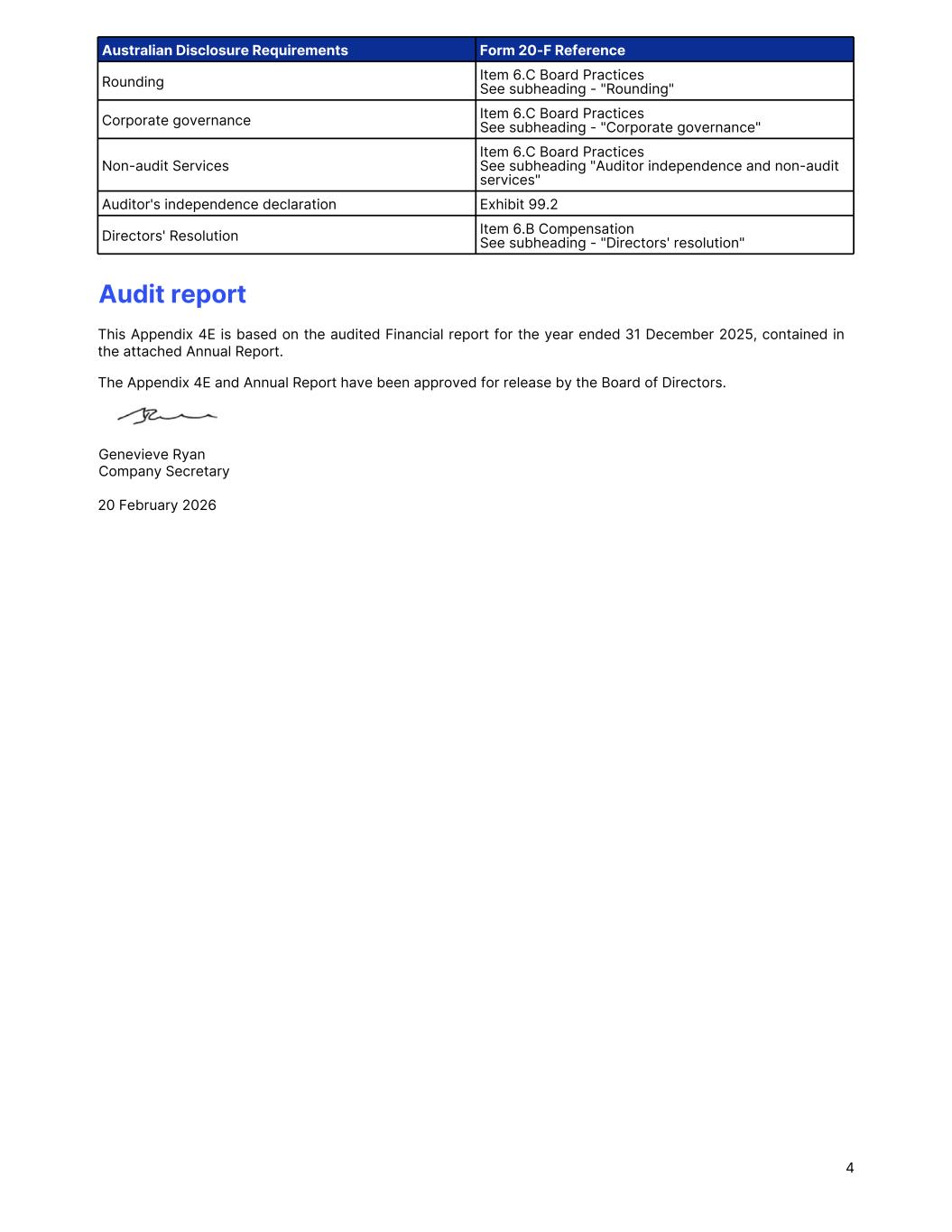 Rounding Item 6.C Board Practices See subheading - "Rounding" Corporate governance Item 6.C Board Practices See subheading - "Corporate governance" Non-audit Services Item 6.C Board Practices See subheading "Auditor independence and non-audit services" Auditor's independence declaration Exhibit 99.2 Directors' Resolution Item 6.B Compensation See subheading - "Directors' resolution" Australian Disclosure Requirements Form 20-F Reference Audit report This Appendix 4E is based on the audited Financial report for the year ended 31 December 2025, contained in the attached Annual Report. The Appendix 4E and Annual Report have been approved for release by the Board of Directors. Genevieve Ryan Company Secretary 20 February 2026 4