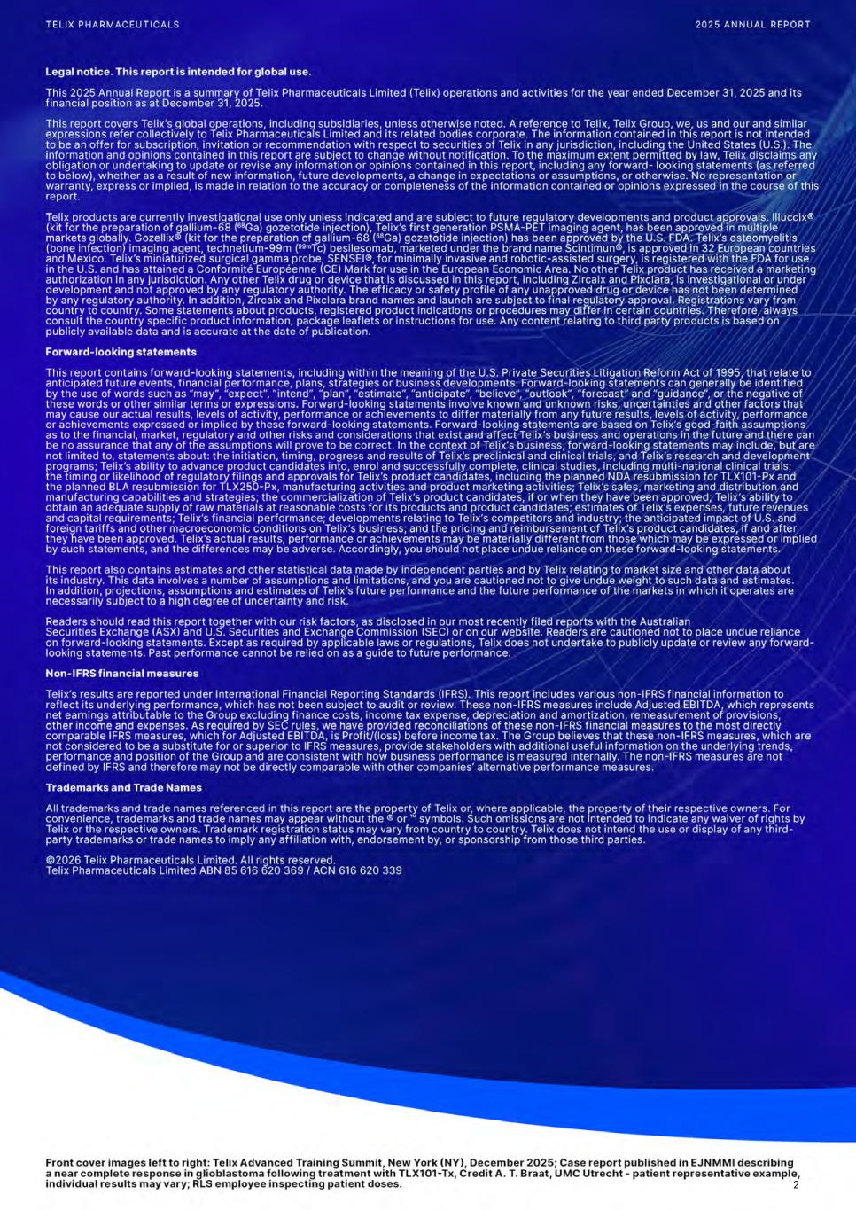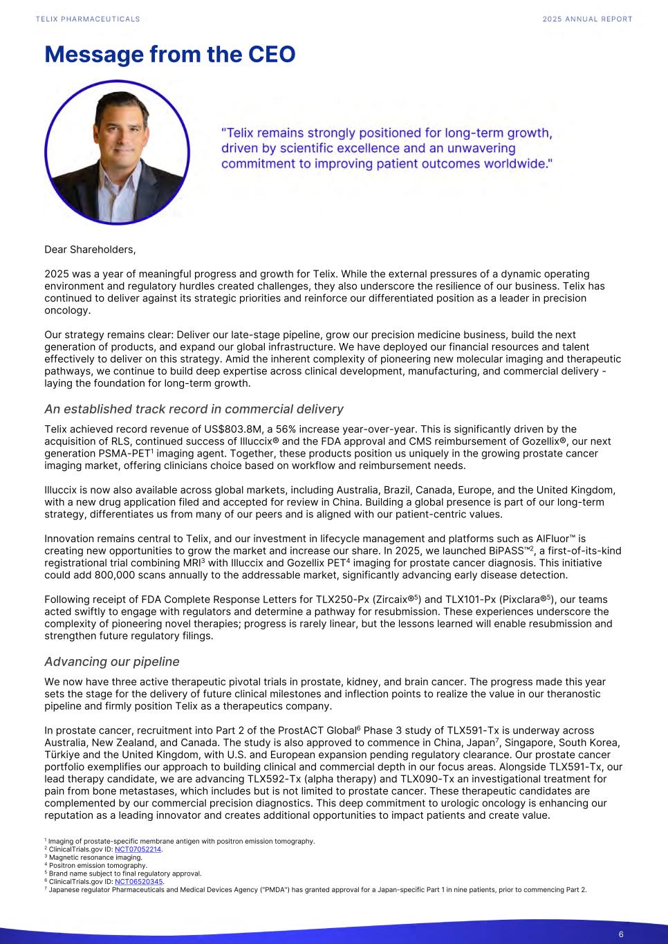 Message from the CEO Dear Shareholders, 2025 was a year of meaningful progress and growth for Telix. While the external pressures of a dynamic operating environment and regulatory hurdles created challenges, they also underscore the resilience of our business. Telix has continued to deliver against its strategic priorities and reinforce our differentiated position as a leader in precision oncology. Our strategy remains clear: Deliver our late-stage pipeline, grow our precision medicine business, build the next generation of products, and expand our global infrastructure. We have deployed our financial resources and talent effectively to deliver on this strategy. Amid the inherent complexity of pioneering new molecular imaging and therapeutic pathways, we continue to build deep expertise across clinical development, manufacturing, and commercial delivery - laying the foundation for long-term growth. An established track record in commercial delivery Telix achieved record revenue of US$803.8M, a 56% increase year-over-year. This is significantly driven by the acquisition of RLS, continued success of Illuccix® and the FDA approval and CMS reimbursement of Gozellix®, our next generation PSMA-PET1 imaging agent. Together, these products position us uniquely in the growing prostate cancer imaging market, offering clinicians choice based on workflow and reimbursement needs. Illuccix is now also available across global markets, including Australia, Brazil, Canada, Europe, and the United Kingdom, with a new drug application filed and accepted for review in China. Building a global presence is part of our long-term strategy, differentiates us from many of our peers and is aligned with our patient-centric values. Innovation remains central to Telix, and our investment in lifecycle management and platforms such as AlFluor™ is creating new opportunities to grow the market and increase our share. In 2025, we launched BiPASS™2, a first-of-its-kind registrational trial combining MRI3 with Illuccix and Gozellix PET4 imaging for prostate cancer diagnosis. This initiative could add 800,000 scans annually to the addressable market, significantly advancing early disease detection. Following receipt of FDA Complete Response Letters for TLX250-Px (Zircaix®5) and TLX101-Px (Pixclara®5), our teams acted swiftly to engage with regulators and determine a pathway for resubmission. These experiences underscore the complexity of pioneering novel therapies; progress is rarely linear, but the lessons learned will enable resubmission and strengthen future regulatory filings. Advancing our pipeline We now have three active therapeutic pivotal trials in prostate, kidney, and brain cancer. The progress made this year sets the stage for the delivery of future clinical milestones and inflection points to realize the value in our theranostic pipeline and firmly position Telix as a therapeutics company. In prostate cancer, recruitment into Part 2 of the ProstACT Global6 Phase 3 study of TLX591-Tx is underway across Australia, New Zealand, and Canada. The study is also approved to commence in China, Japan7, Singapore, South Korea, Türkiye and the United Kingdom, with U.S. and European expansion pending regulatory clearance. Our prostate cancer portfolio exemplifies our approach to building clinical and commercial depth in our focus areas. Alongside TLX591-Tx, our lead therapy candidate, we are advancing TLX592-Tx (alpha therapy) and TLX090-Tx an investigational treatment for pain from bone metastases, which includes but is not limited to prostate cancer. These therapeutic candidates are complemented by our commercial precision diagnostics. This deep commitment to urologic oncology is enhancing our reputation as a leading innovator and creates additional opportunities to impact patients and create value. 6 1 Imaging of prostate-specific membrane antigen with positron emission tomography. 2 ClinicalTrials.gov ID: NCT07052214. 3 Magnetic resonance imaging. 4 Positron emission tomography. 5 Brand name subject to final regulatory approval. 6 ClinicalTrials.gov ID: NCT06520345. 7 Japanese regulator Pharmaceuticals and Medical Devices Agency ("PMDA") has granted approval for a Japan-specific Part 1 in nine patients, prior to commencing Part 2.